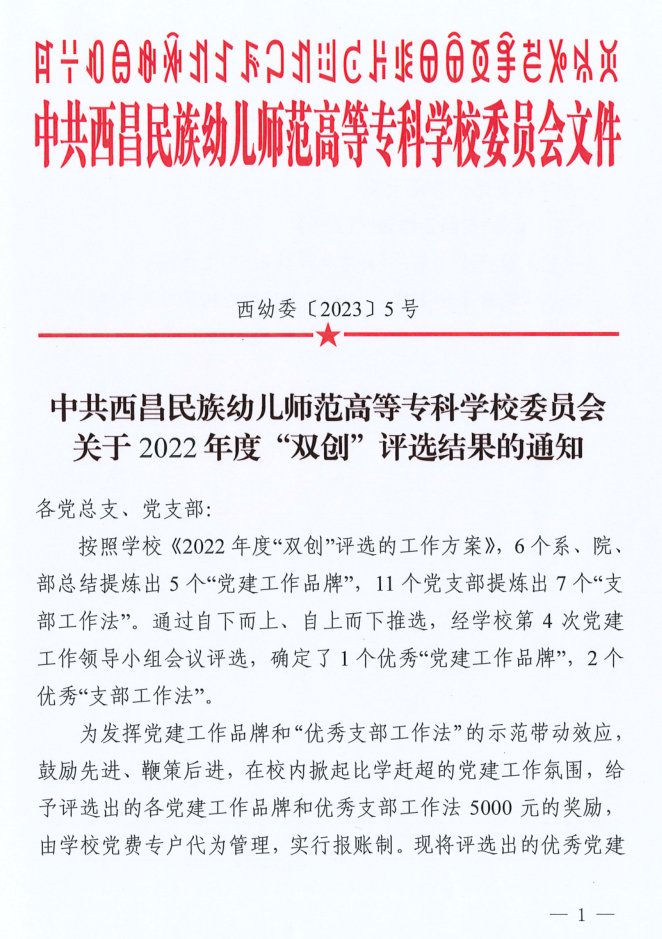 中共西昌民族幼儿师范高等专科学校委员会 关于2022年度“双创”评选结果的通知