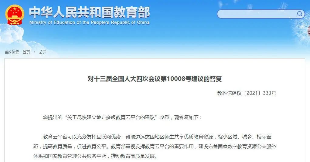 日前,针对十三届全国人大四次会议第10008号(教科信建议〔2021〕333号)建议《关于尽快建立地方多级教育云平台的建议》,教育部网站公布其答复情况。