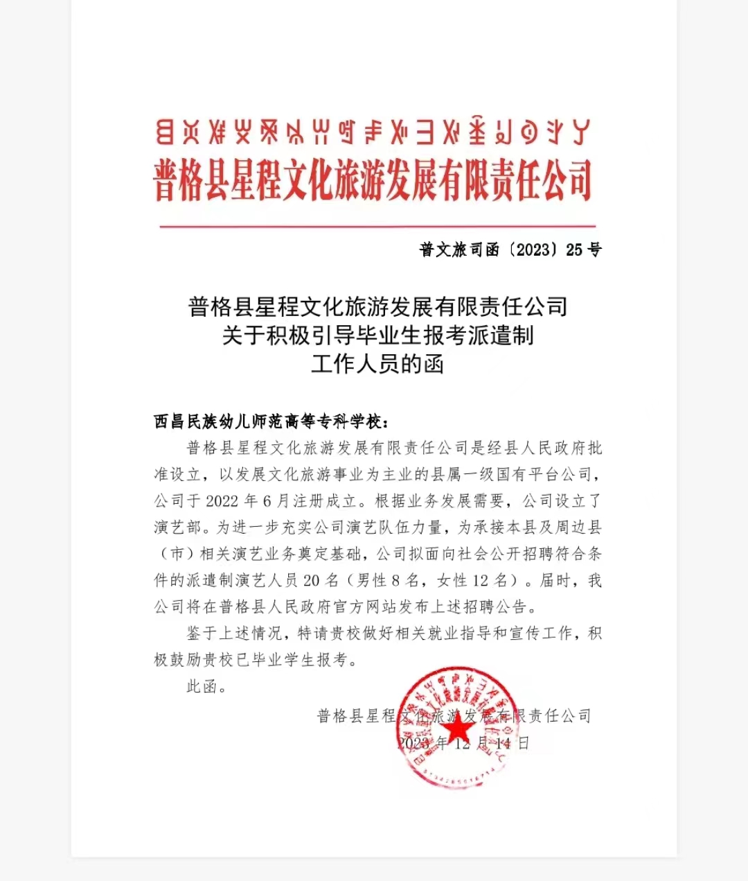 普格县星程文化旅游发展有限责任公司招聘信息