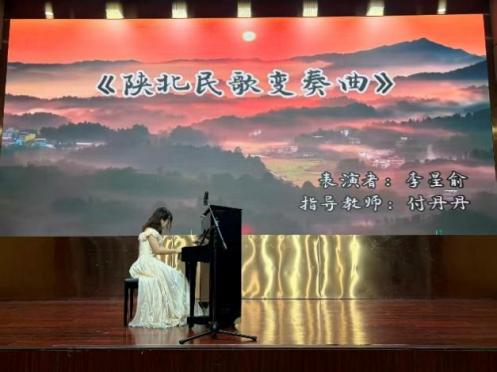 随后,音乐会进入“山河礼赞,乐韵承情”篇章,每一曲都承载着对祖国大地的深情礼赞。合唱《祖国之子》诉说赤子之心;四手联弹《在希望的田野上》的灵动琴音勾勒丰收画卷;钢琴独奏《九儿》宛转悠扬,道尽山河间的动人故事;古筝协奏《唱支山歌给党听》琴筝和鸣,满是感恩与敬仰;钢琴独奏《陕北民歌变奏曲》则让黄土高原的粗犷与豪迈在指尖绽放。