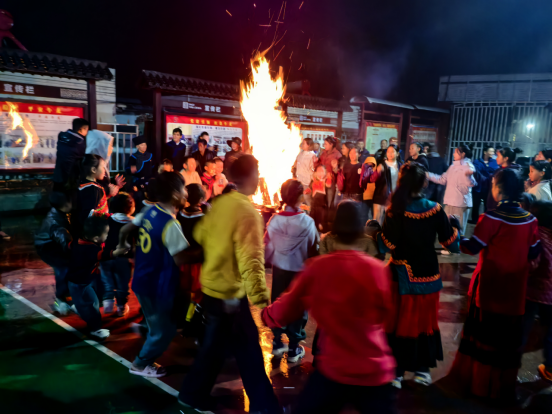 文艺汇演结束后,熊熊篝火在村委会广场点燃,全体村民、驻村工作队与我校师生手拉手,围着篝火欢快起舞,共跳彝族传统《达体舞》。火光映照着一张张笑脸,欢快的舞步踏出民族团结的和谐韵律,激昂的歌声唱响乡村振兴的壮美篇章,将整场活动推向最高潮,为此次文化盛宴画上圆满句号。