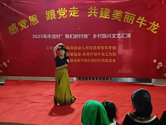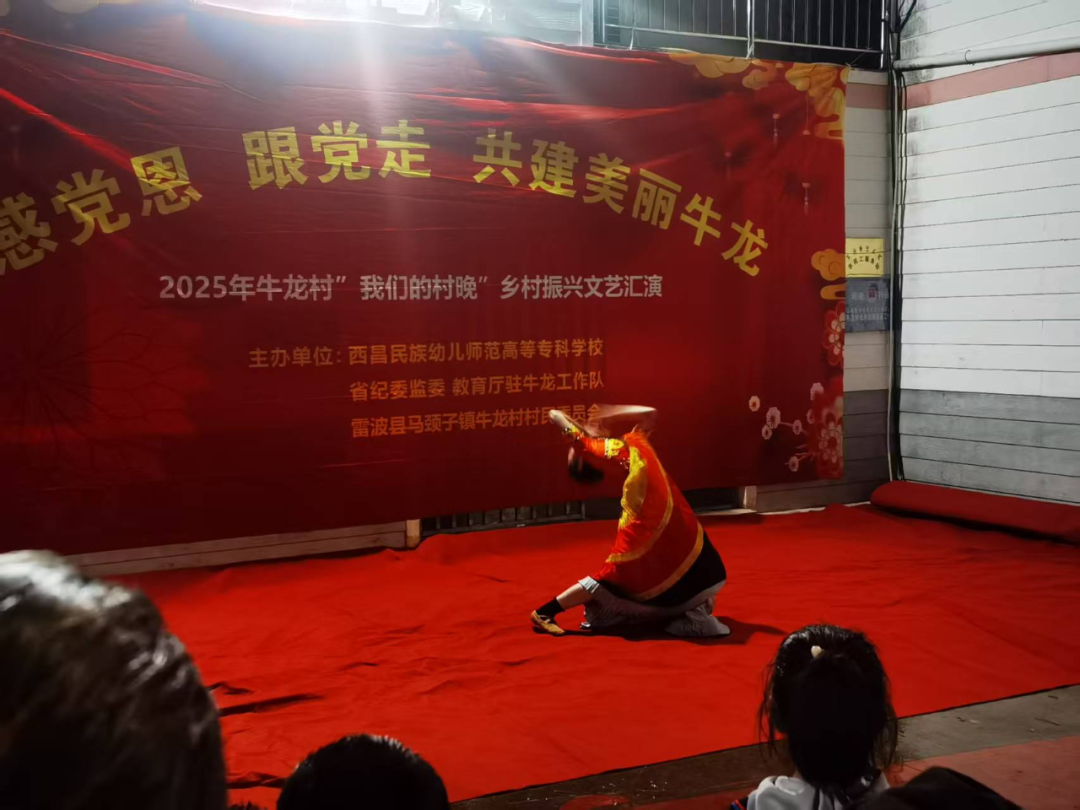 当晚,“我们的村晚”文艺汇演在婆娑小雨中温情上演,点亮了彝家村寨的夜晚。晚会以“感党恩 跟党走 共建美丽牛龙”为主题,节目异彩纷呈:我校师生带来的《彝族高腔》《我的情歌》情深意长,舞蹈《姑娘的红裙》《姑娘的耳环》绚丽夺目。最终,全体观众在学生月琴伴奏的《留客歌》中齐声合唱,将彝族同胞的热情好客展现得淋漓尽致。其间穿插的多轮抽奖环节,更为村民们送上了驻村工作队与我校准备的精美礼品,现场欢声笑语,气氛热烈。