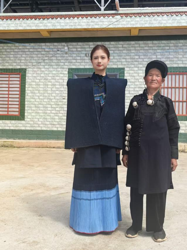 ▲图左为曾品鉴老师试穿价值近万元的布拖蒉染彝族服饰,图右为蒉染服饰制作人▲