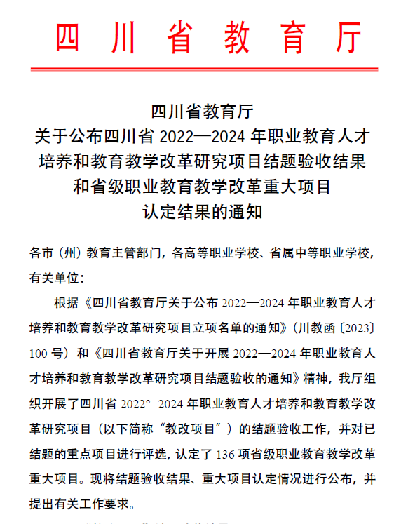 日前,四川省教育厅揭晓2022-2024年职业教育人才培养与教育教学改革研究项目验收结果。我校艺术教育系省级教改重点项目《凉山彝族(音、舞、美、体)艺术的整合课程价值挖掘与手册式教材开发》凭借扎实的研究成果和创新实践,顺利通过评审实现高质量结项。该成果不仅是我校深耕艺术类专业内涵建设、推动教育教学改革纵深发展的有力见证,更标志着我校在民族艺术教育资源开发、特色课程体系构建领域取得重大突破,为职业院校艺术教育改革与民族文化传承创新提供了可借鉴的实践样本。