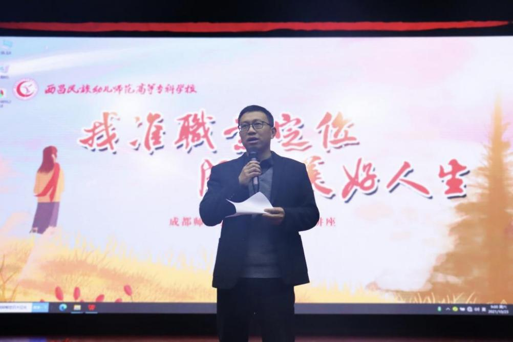 为应对大学生职业规划和严峻的就业形势,助力我系学生找准职业定位,提升自身就业能力,帮助同学们更好地进行职业规划尽早做好就业准备,2021年10月23早上9点雏鹰剧场开展了《找准职业定位 成就美好人生》专题讲座。讲座邀请了成都师范学院职业道德生涯名师——张晶老师。