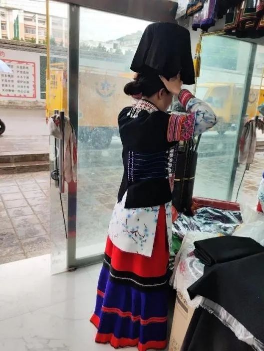 ▲调研组老师试穿会东彝族服饰▲
