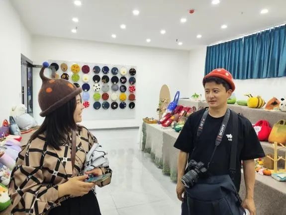 该店铺依托毛毡非遗大师开设,仅在网络上进行售卖。直播团队现场演示羊毛毡制品(如毡帽、挂毯)与挑花刺绣元素的跨界设计,同时参观了仓储物流区。
