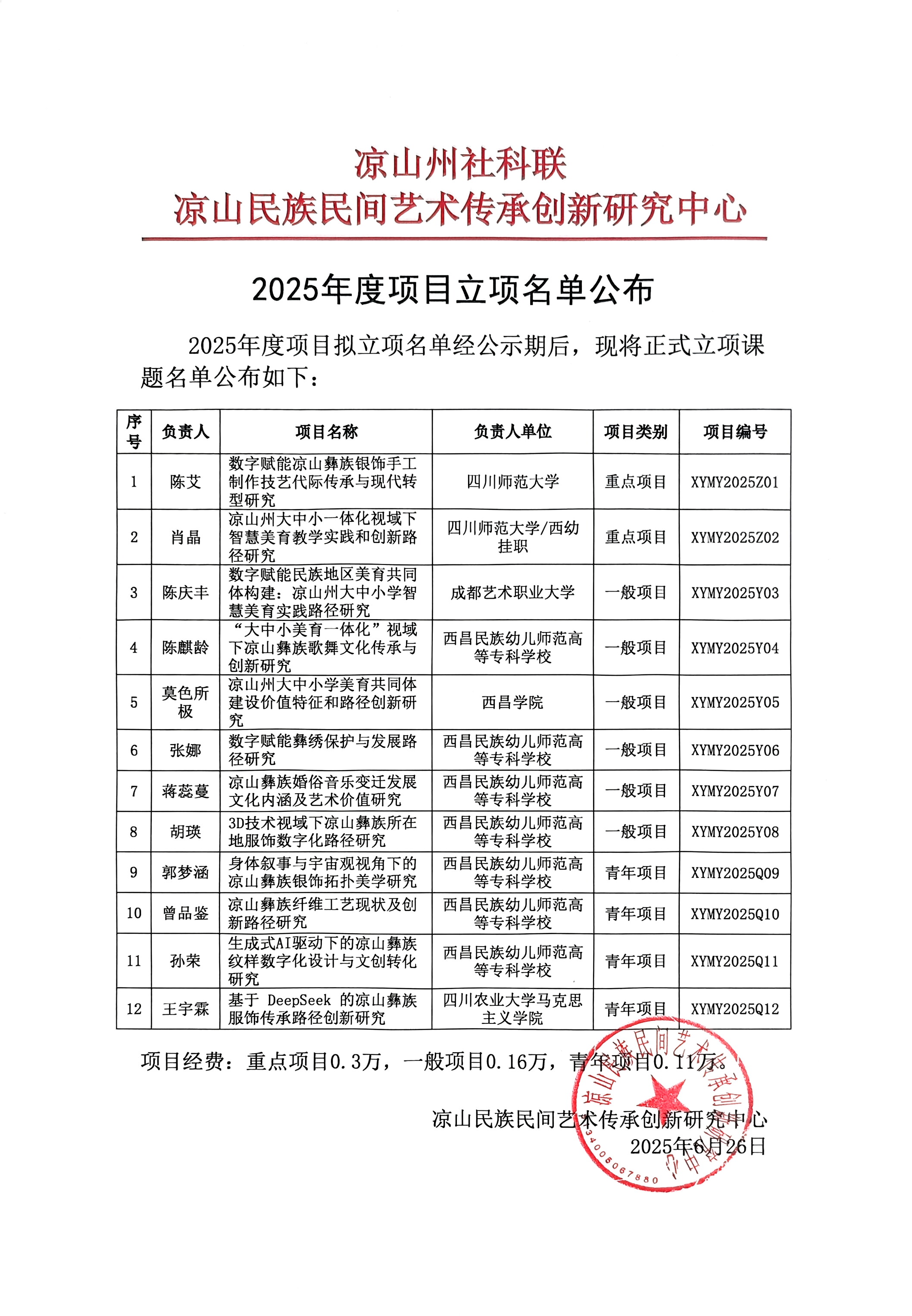 根据凉山民族民间艺术传承研究中心《凉山民族民间艺术传承研究中心项目管理办法》和《2025年度科研课题项目申报指南》相关要求,中心组织专家对收到的申报材料进行了资格审查、匿名初评、集中复评、会议终评,拟立项12项课题。经公示期后,现将立项课题名单予以公布(见附件)。