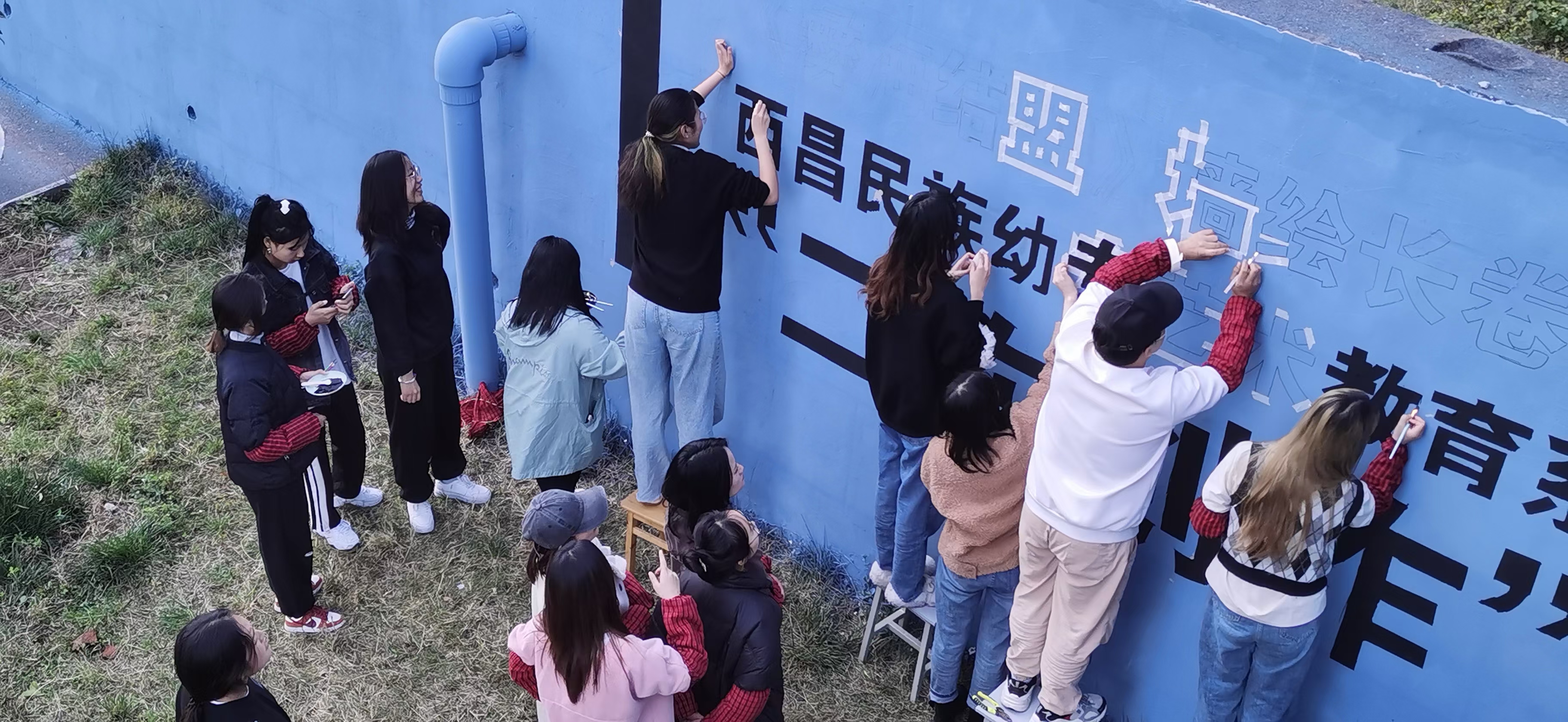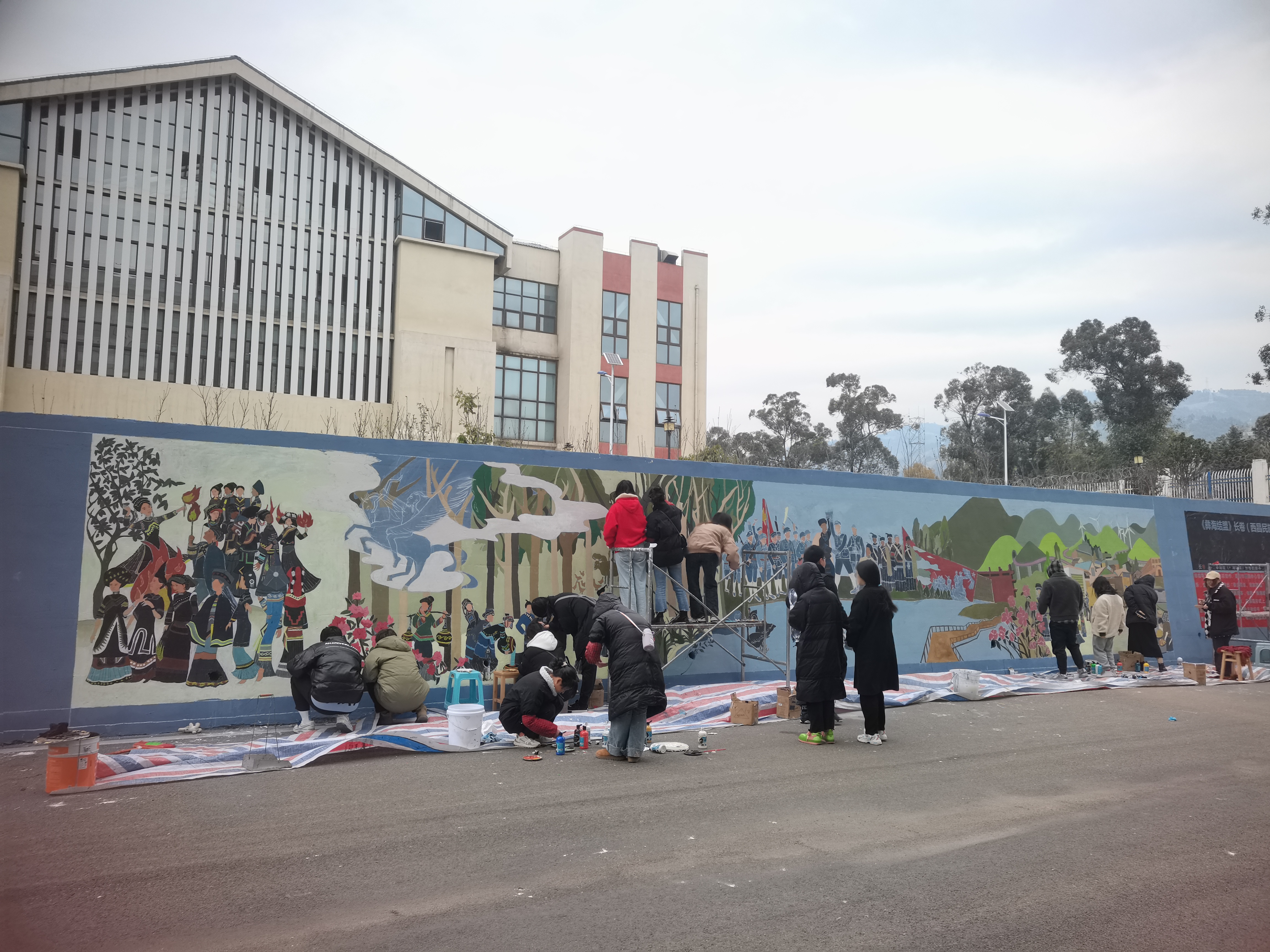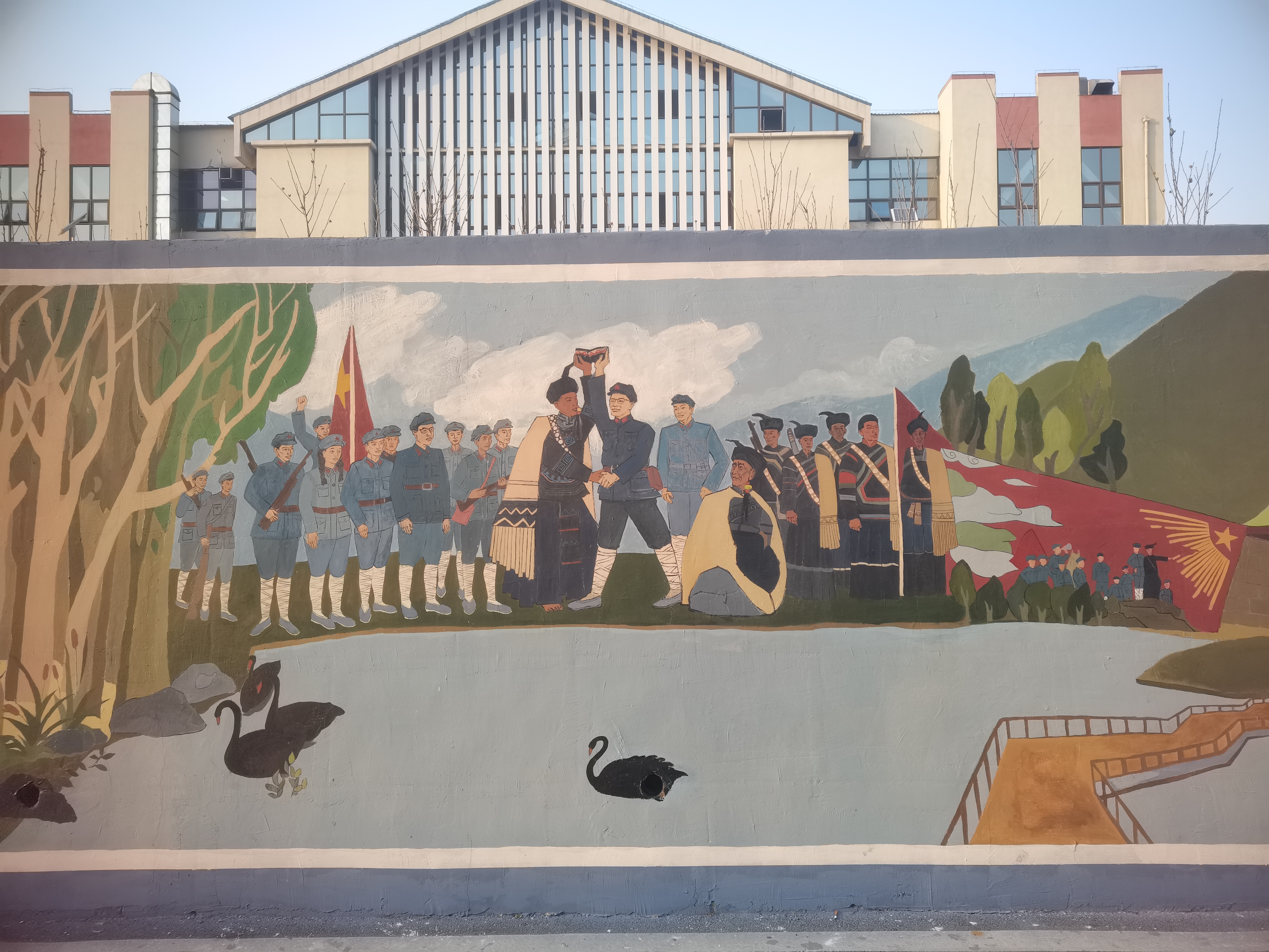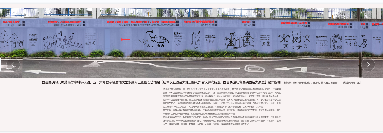 “千人墙绘”项目,就是此次联合教学创作的衍生作品。墙绘分为两个区,分别是A区《红军长征途径凉山暨礼州会议彝海结盟》长卷的“古彝-中华上古图绘创作原理版”;B区墙绘《彝海结盟》(西昌民族幼专二次创作版)。A区古朴感和B区艺术的现代感相映成趣,构成艺术表现手法及中华源头文脉思维的生动对比印证。