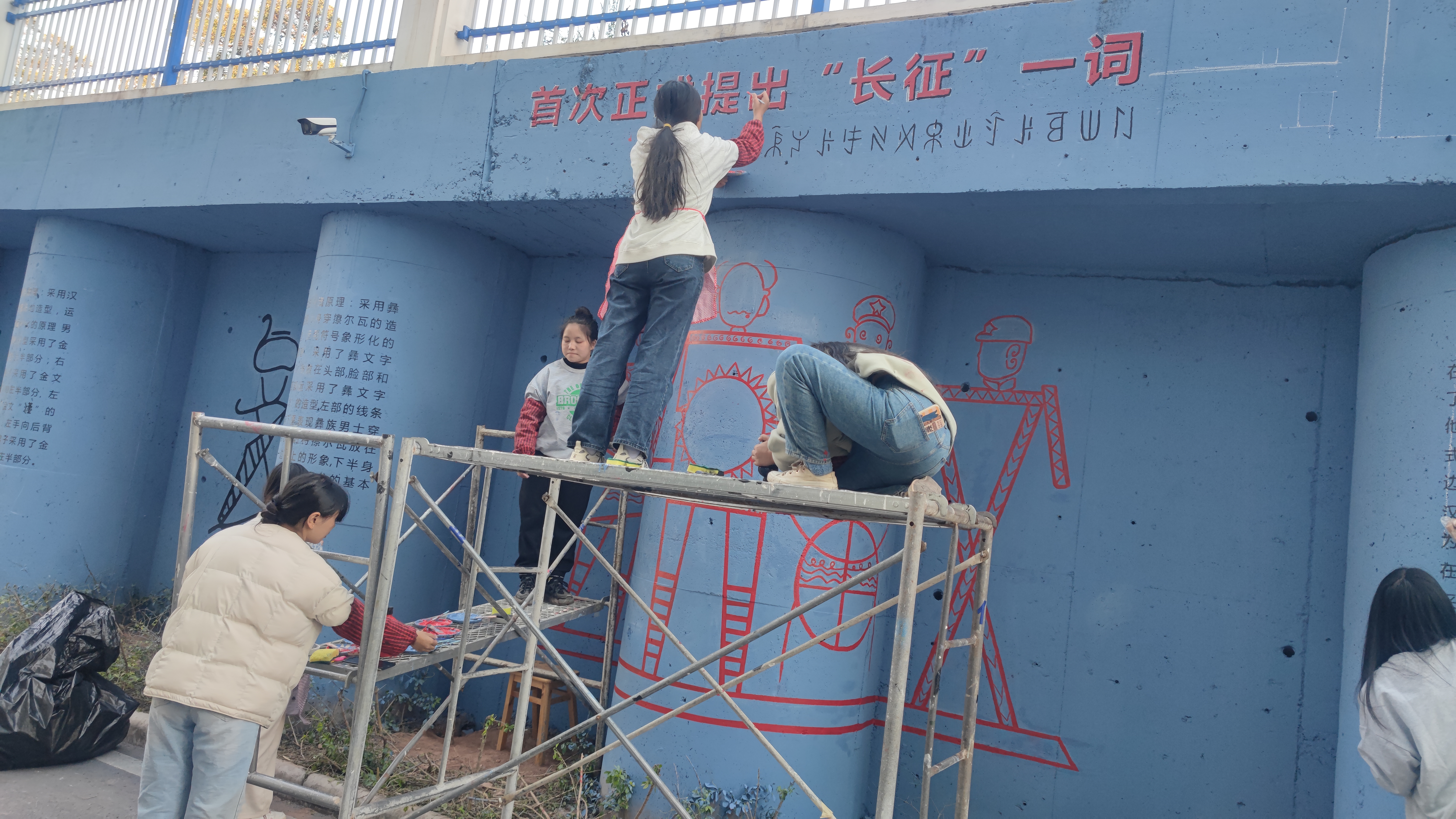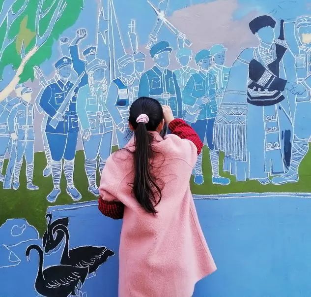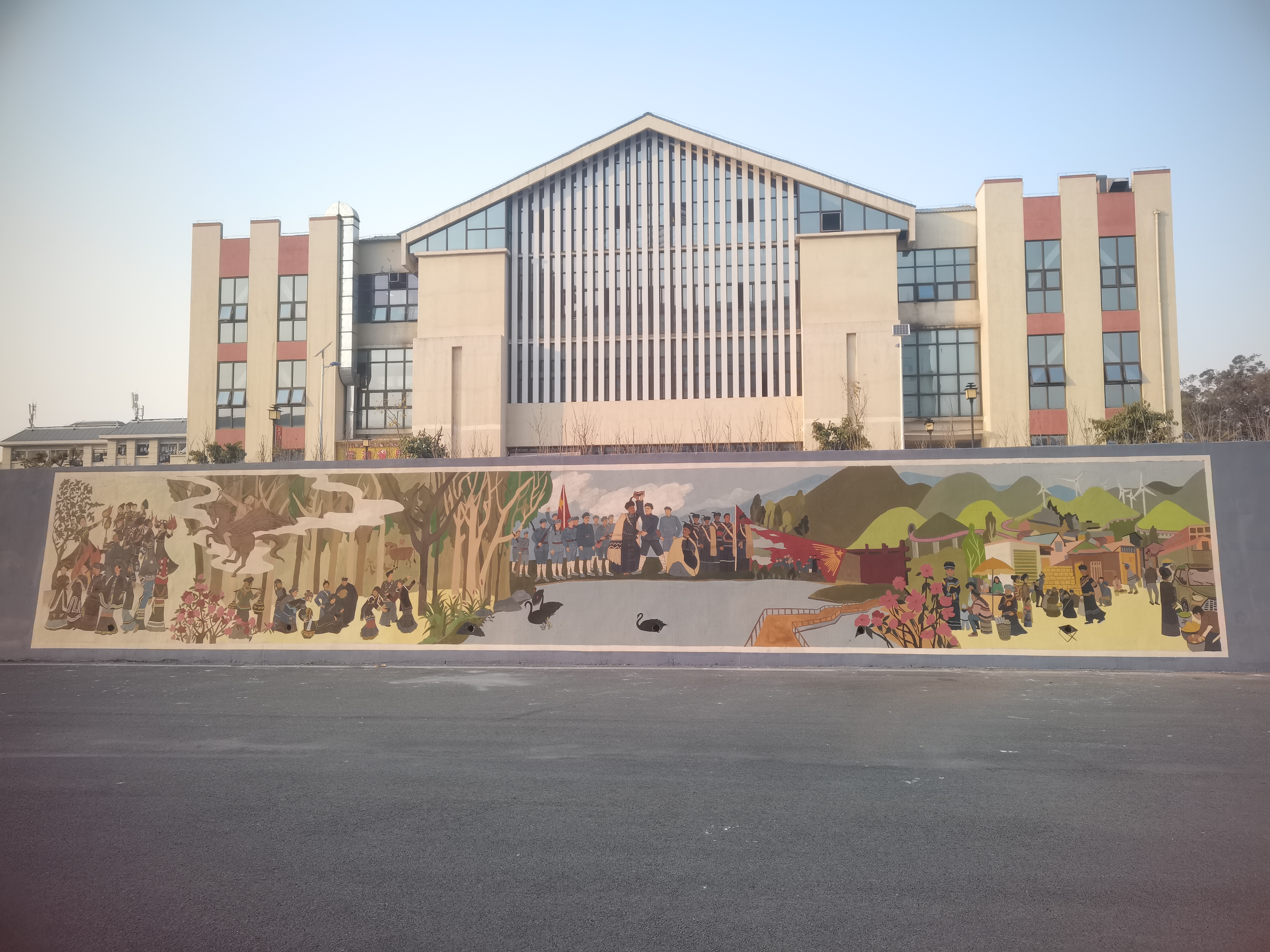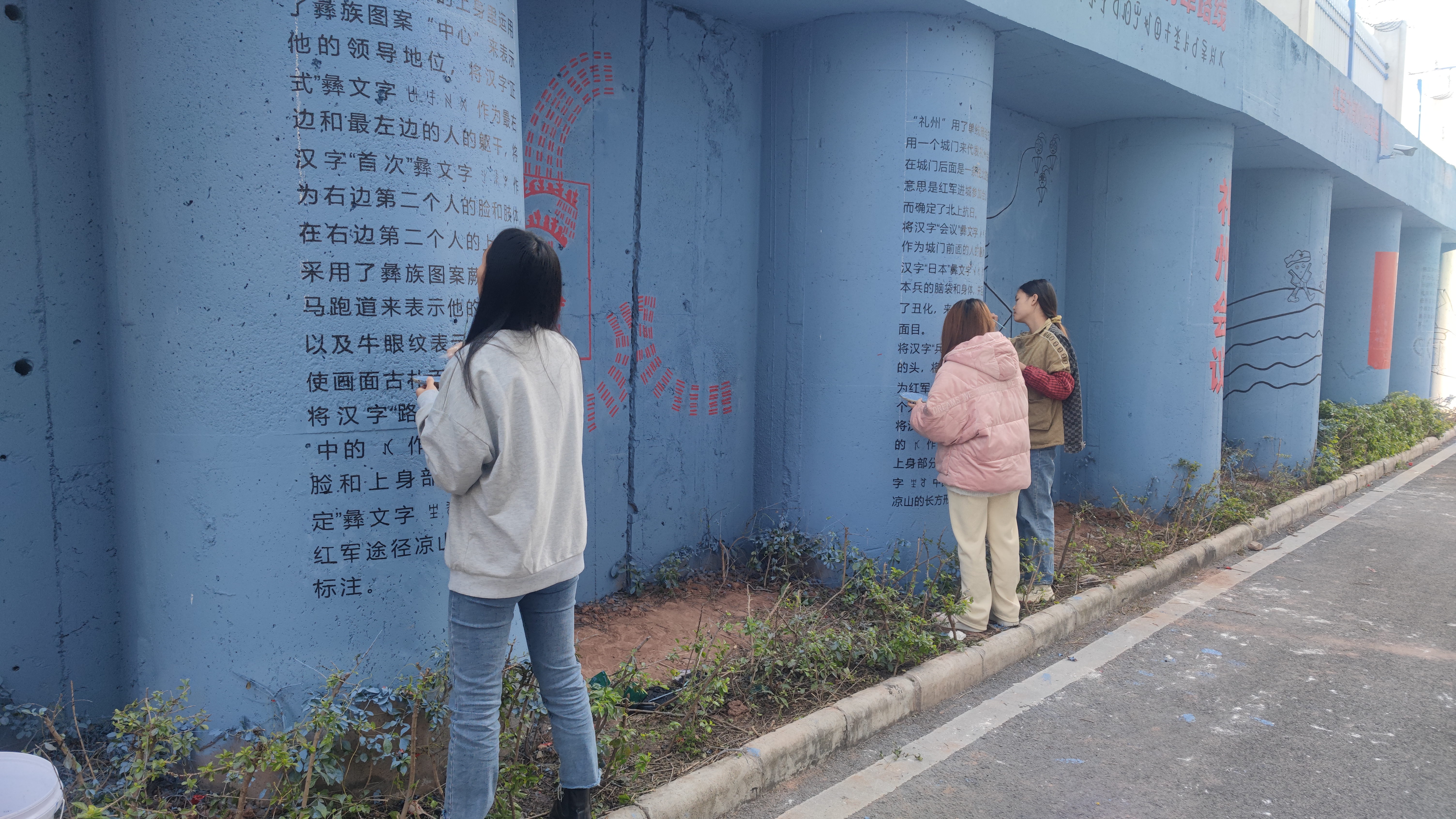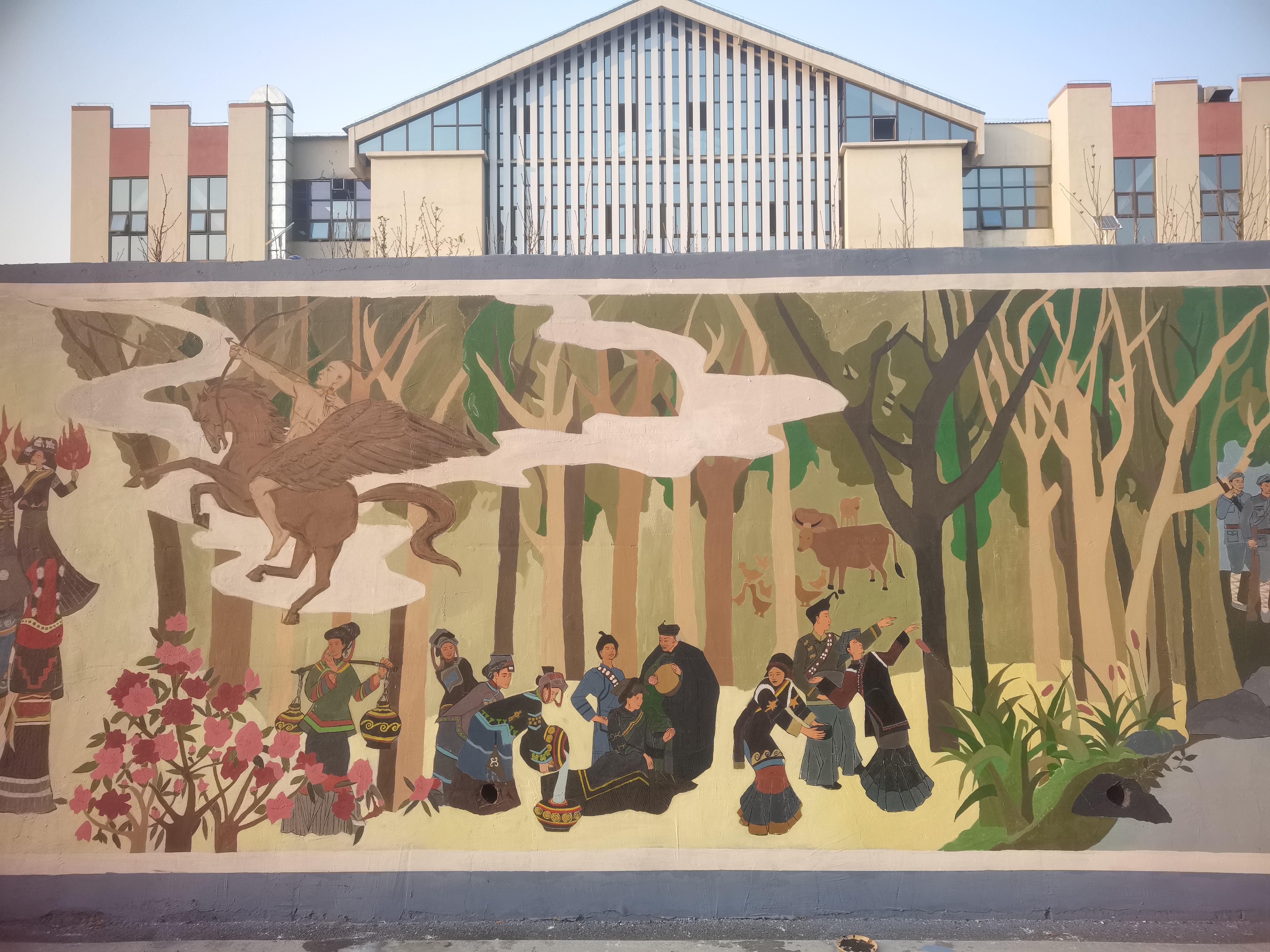 “千人墙绘”项目,就是此次联合教学创作的衍生作品。墙绘分为两个区,分别是A区《红军长征途径凉山暨礼州会议彝海结盟》长卷的“古彝-中华上古图绘创作原理版”;B区墙绘《彝海结盟》(西昌民族幼专二次创作版)。A区古朴感和B区艺术的现代感相映成趣,构成艺术表现手法及中华源头文脉思维的生动对比印证。