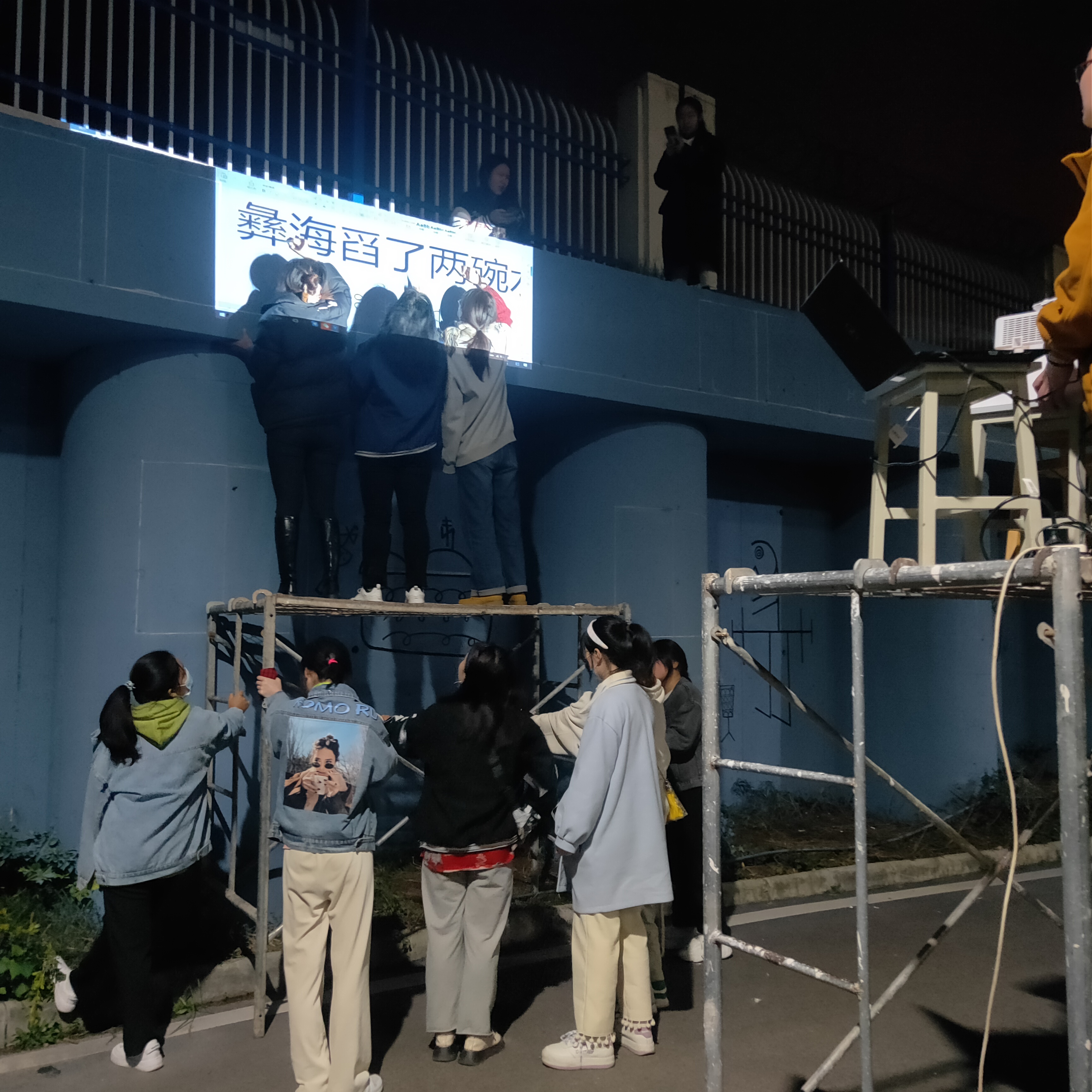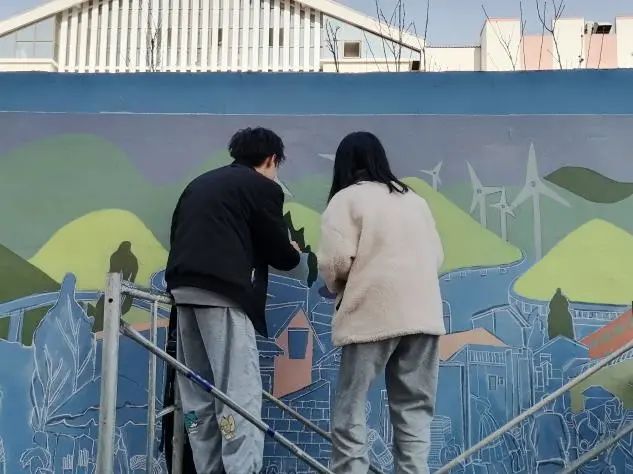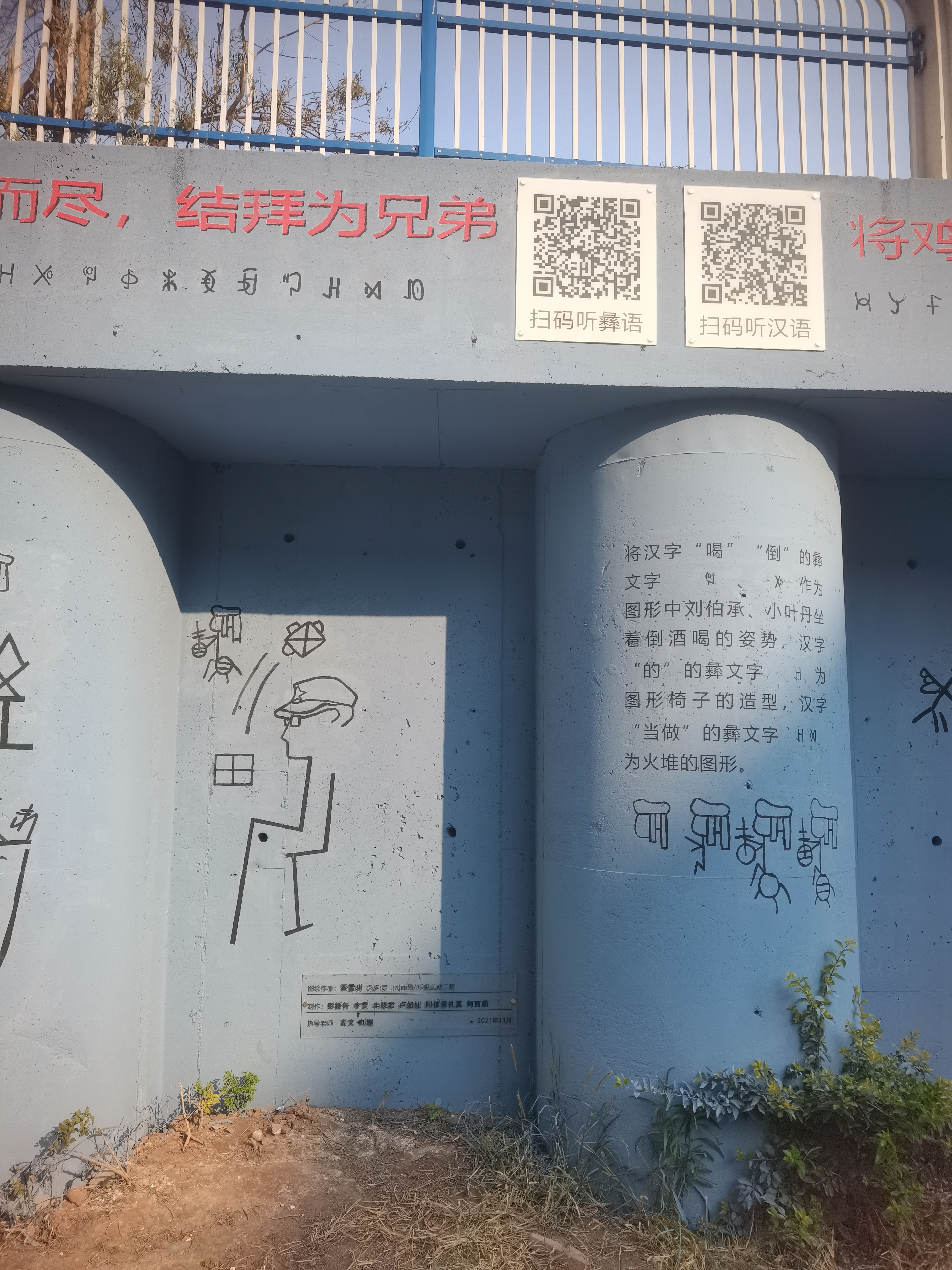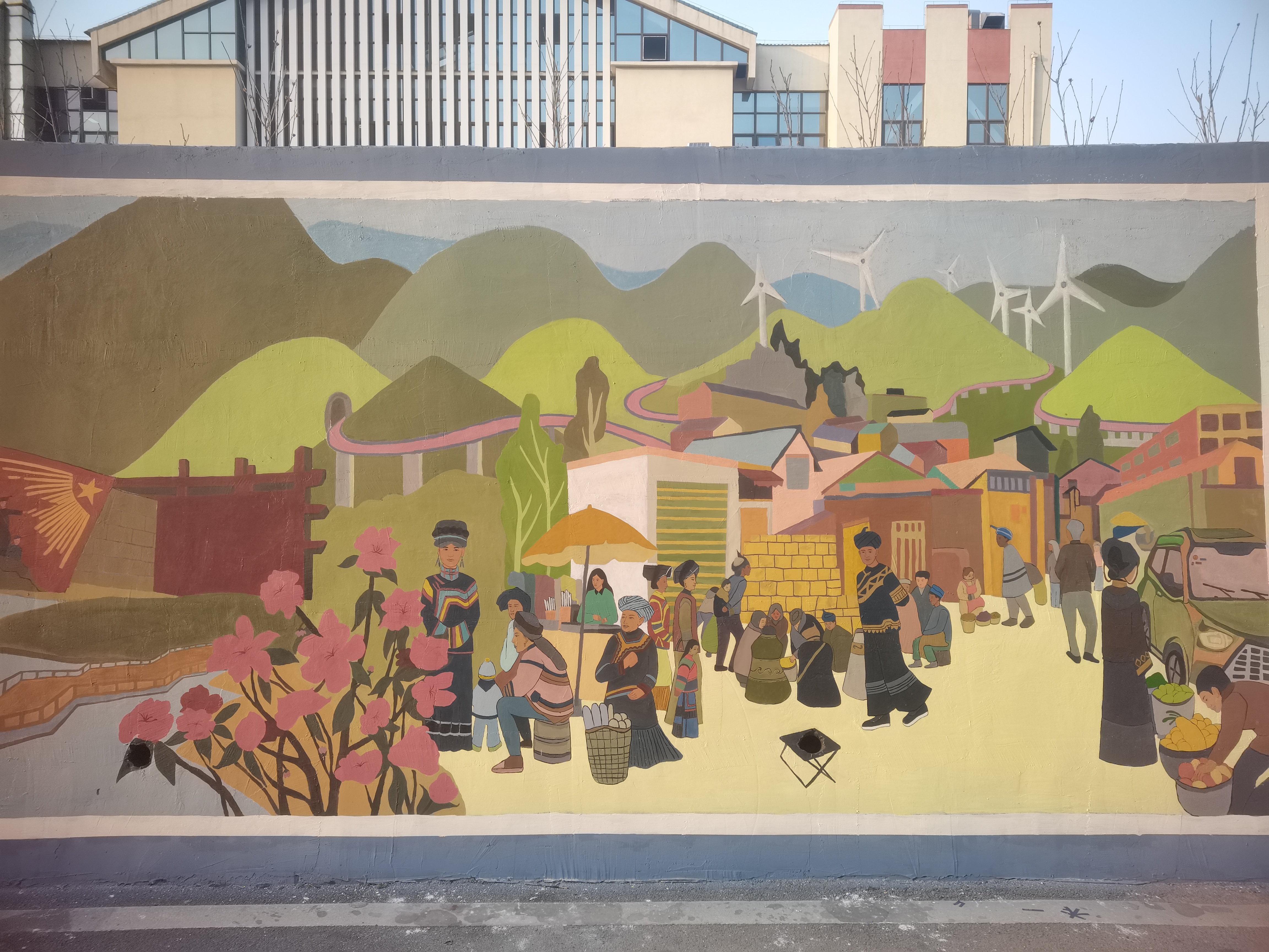 “千人墙绘”项目,就是此次联合教学创作的衍生作品。墙绘分为两个区,分别是A区《红军长征途径凉山暨礼州会议彝海结盟》长卷的“古彝-中华上古图绘创作原理版”;B区墙绘《彝海结盟》(西昌民族幼专二次创作版)。A区古朴感和B区艺术的现代感相映成趣,构成艺术表现手法及中华源头文脉思维的生动对比印证。