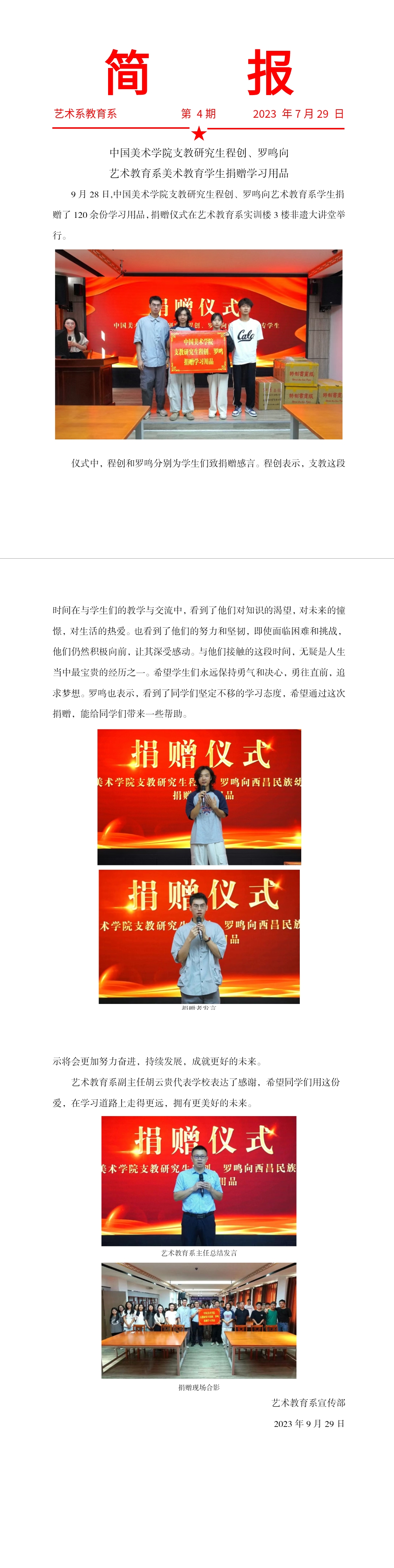 中国美术学院支教研究生程创、罗鸣向艺术教育系美术教育学生捐赠学习用品