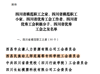 西昌民族幼儿师范高等专科学校工会委员会 荣获四川省模范职工之家