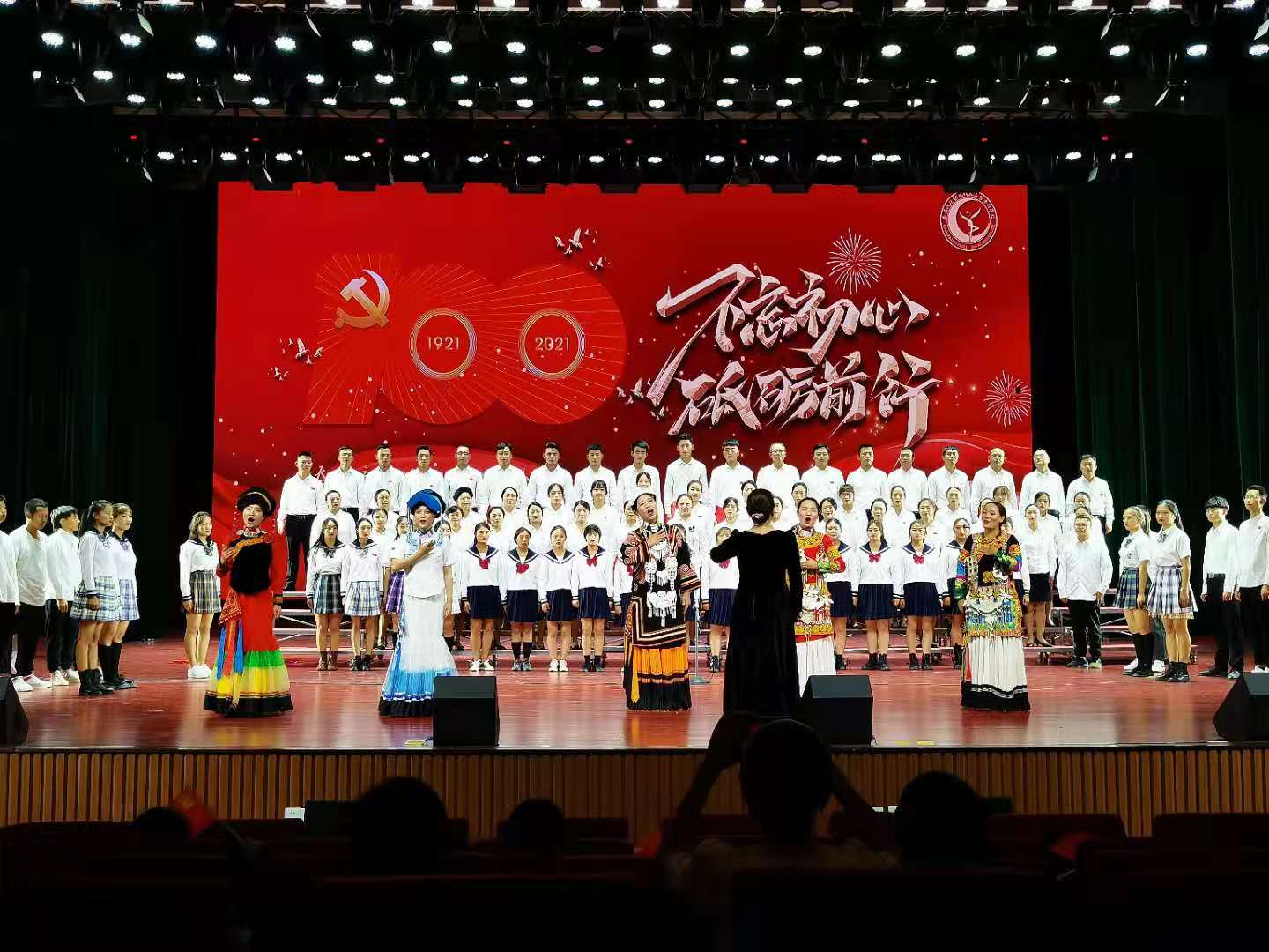 教师组以《不忘初心》为开篇,初心不忘青春志,匠心共筑中国梦。走得再远,走得再光辉的未来,也不能忘记走过的过去,不能忘记为什么出发。不忘初心,方得始终;又以《在灿烂的阳光下》为中篇,全曲从“从小爷爷对我说”唱起,以第一人称的手法,运用十分朴实的语言抒发了对中国 共产 党创建新中国的感激之情,仿佛是一位年轻人饱含深情地在娓娓诉说着长辈给予自己的思想上的启迪。讲述了在党的领导下全国人民走过的风雨历程,赞颂了中华人民共和国成立以来所取得的伟大成就,歌中充满了自豪和赞美;后以《没有共产 党就没有新中 国》为末篇,通过激昂的旋律将全场气氛推向高潮,观众们全体起立挥动着国旗的同时,跟随着这首熟悉、脍炙人口的旋律齐声唱响了今夜!