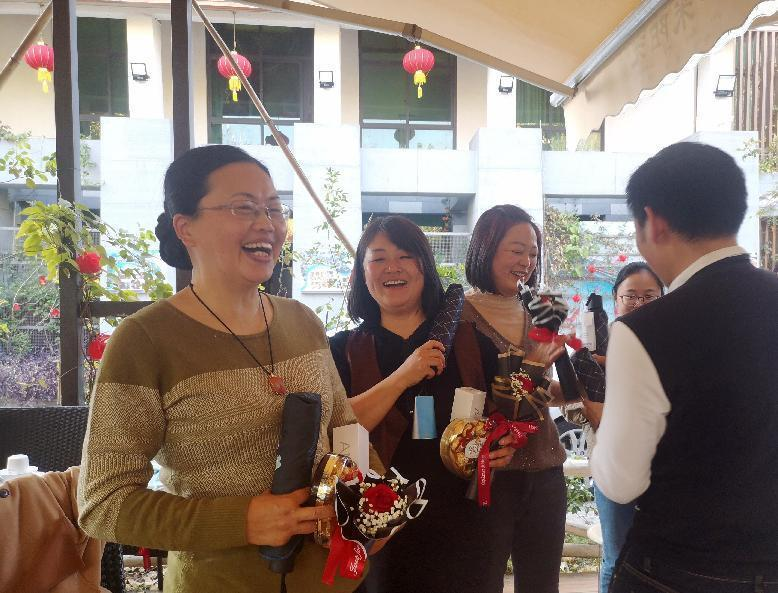 此次活动分为两个部分,一是“互喂香蕉、成语传递、你比我猜”等游戏环节。活动现场,女神们个个踊跃参与,现场气氛热闹,妙趣横生,欢声笑语不断。二是“送温馨、送甜蜜”环节,男老师贴心的为女老师献上祝福和送上载着浓浓情的礼物时,她们感到无比的高兴和感动。