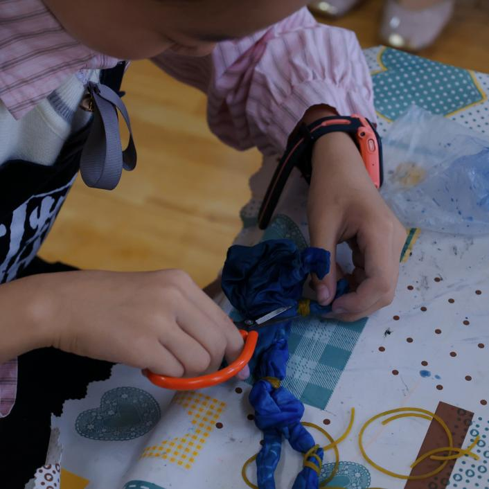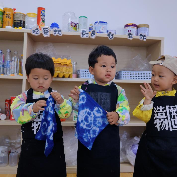 活动伊始,家长与孩子们一同踏入了扎染艺术的殿堂。在老师的耐心指导下,他们共同探索着扎染的奥秘,通过巧妙的捆扎和天然植物染料的运用,为布偶和方巾赋予了独特的纹理与色彩。他们先将布偶的部分区域紧紧捆扎,巧妙地构思出别具一格的纹理和图案。紧接着,他们轻轻将布偶浸入天然植物染料之中,静待色彩的绽放。染料渐渐透进布料,与捆扎处相互作用,勾勒出一幅幅绚丽多彩的画卷。孩子们的脸上洋溢着喜悦与期待,与家长共同编制了一份属于彼此的独特回忆。