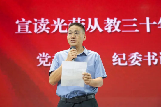 党委委员、纪委书记沙德康宣读光荣从教三十年教师名单,党委书记卢立武,党委副书记、校长赵波为光荣从教三十年教师戴红花、颁发荣誉证书。庄重的颁奖仪式是对教师卓越贡献的充分肯定,现场一次次响起的热烈掌声,凝聚着全校师生对老师们深深的敬意与祝贺。