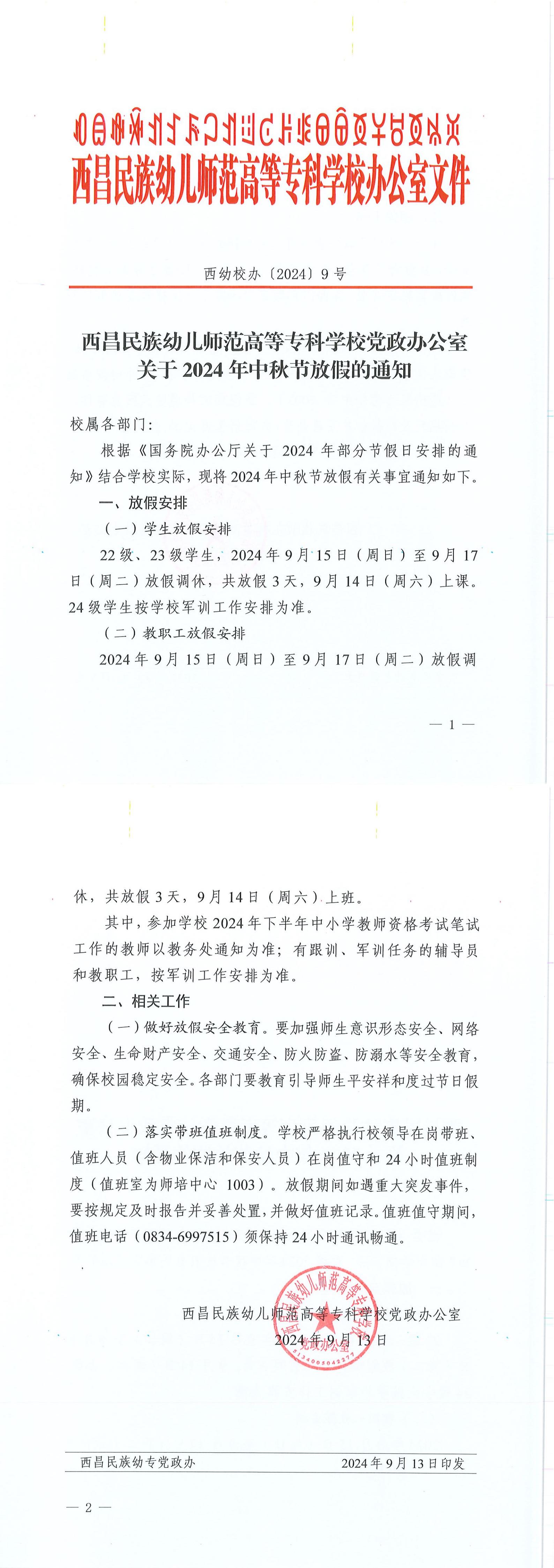 西幼校办〔2024〕10号关于2024年国庆节、州庆放假的通知