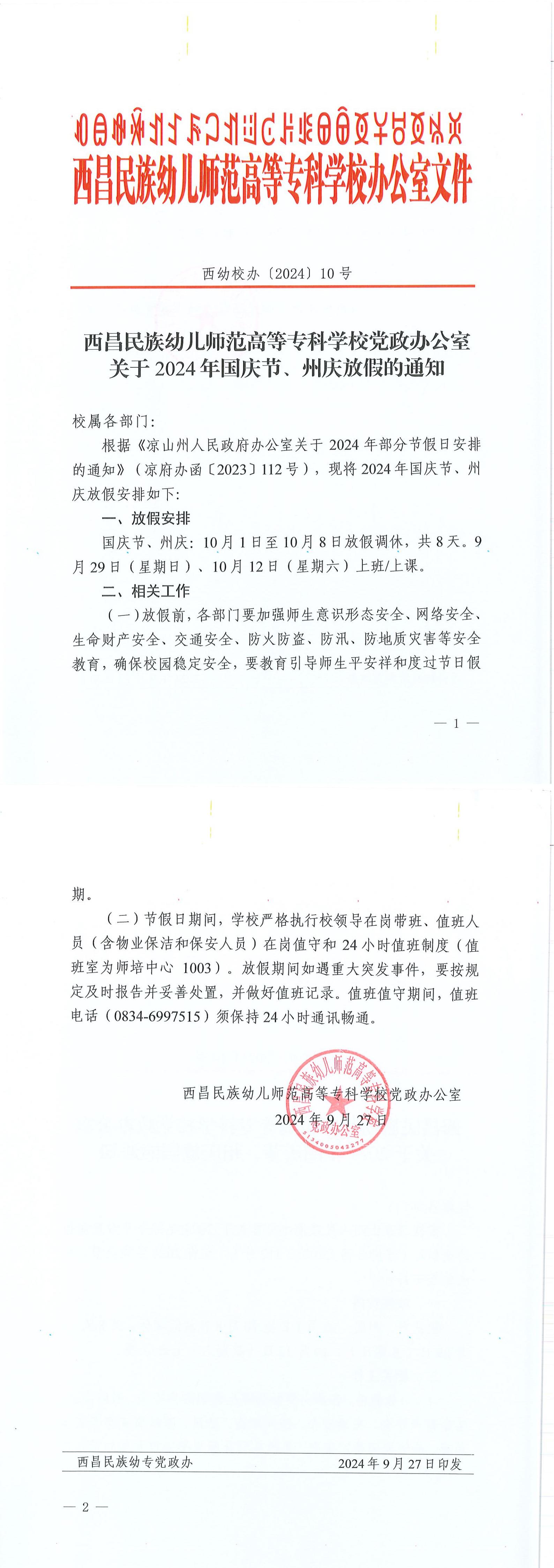 西幼校办〔2024〕10号关于2024年国庆节、州庆放假的通知