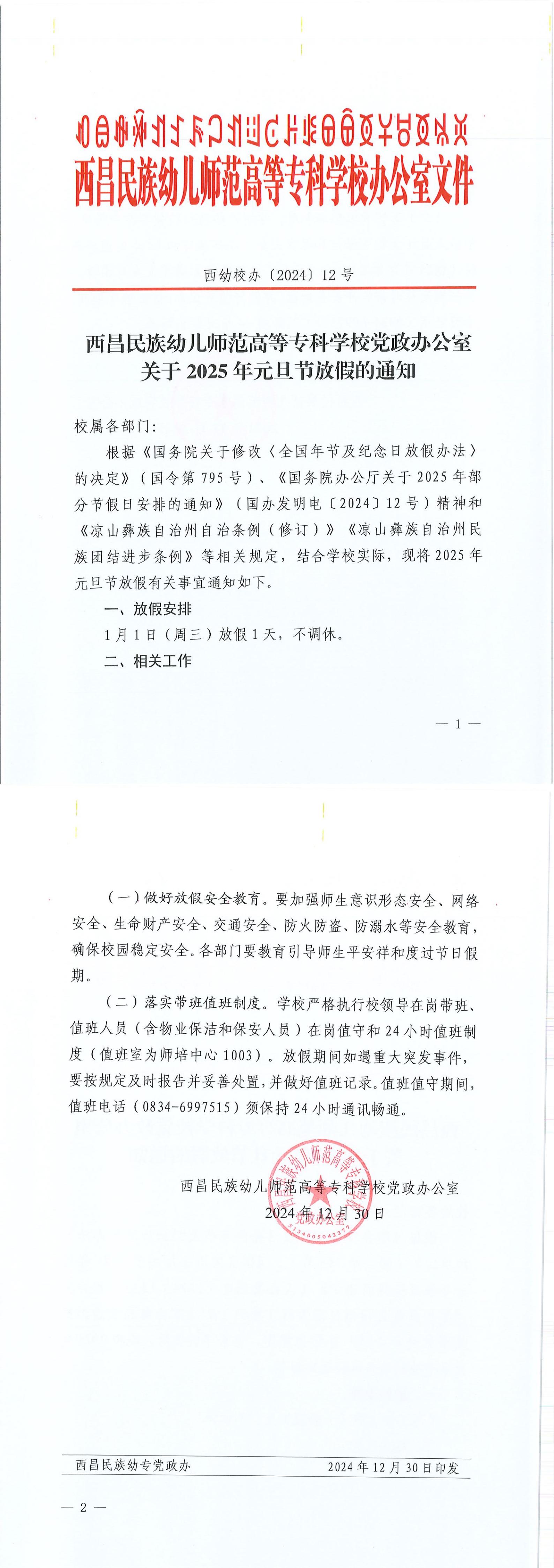 西幼校办〔2024〕12号 关于2025年元旦节放假的通知
