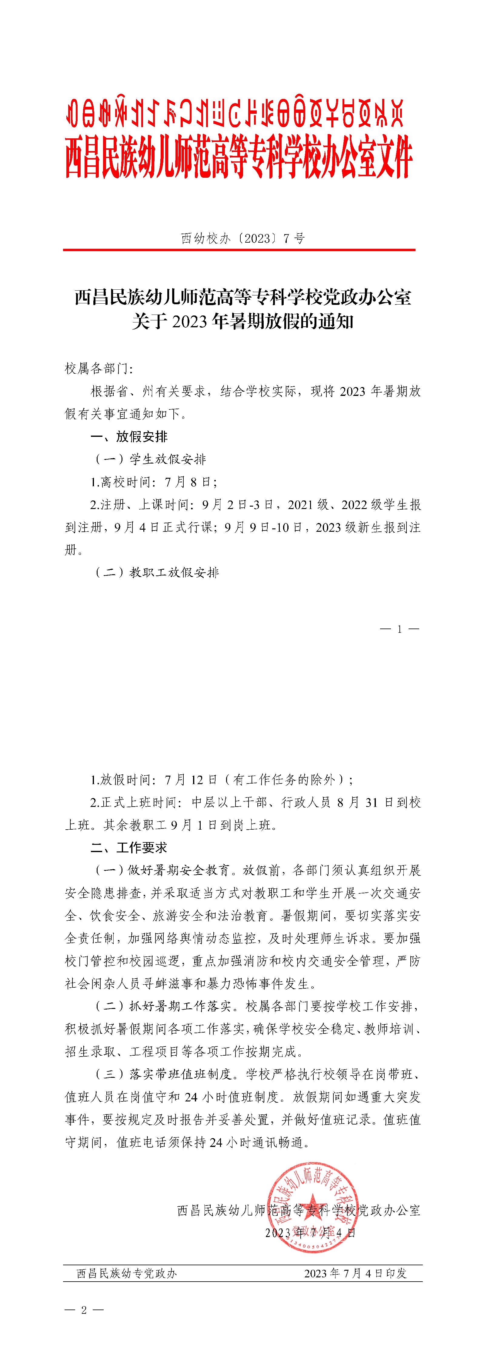2023年暑期放假的通知