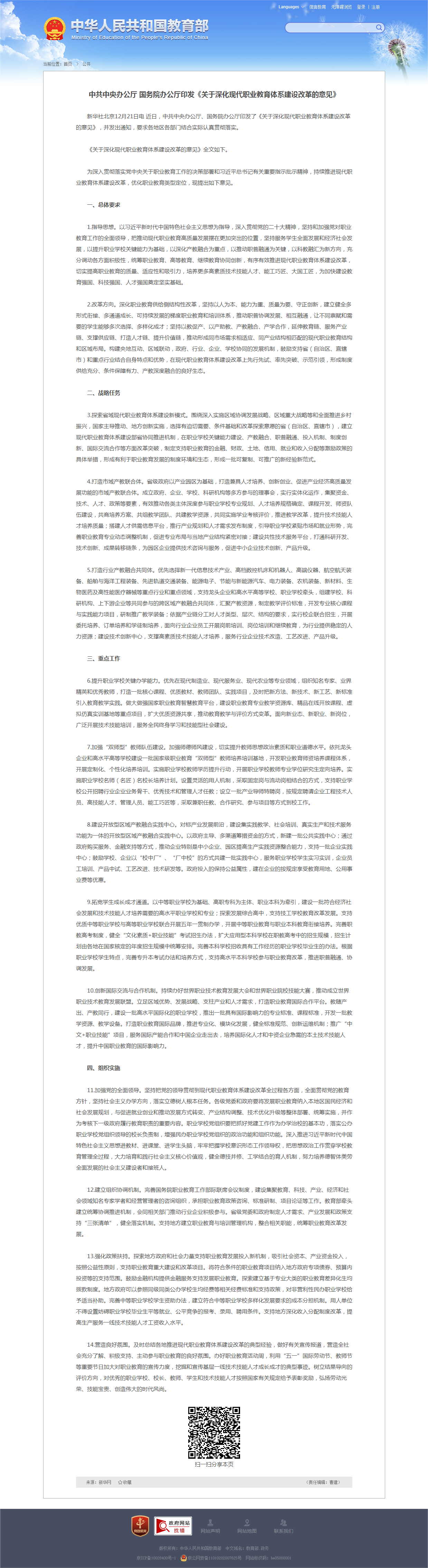 中共中央办公厅 国务院办公厅印发《关于深化现代职业教育体系建设改革的意见》(来源:中华人民共和国教育部)