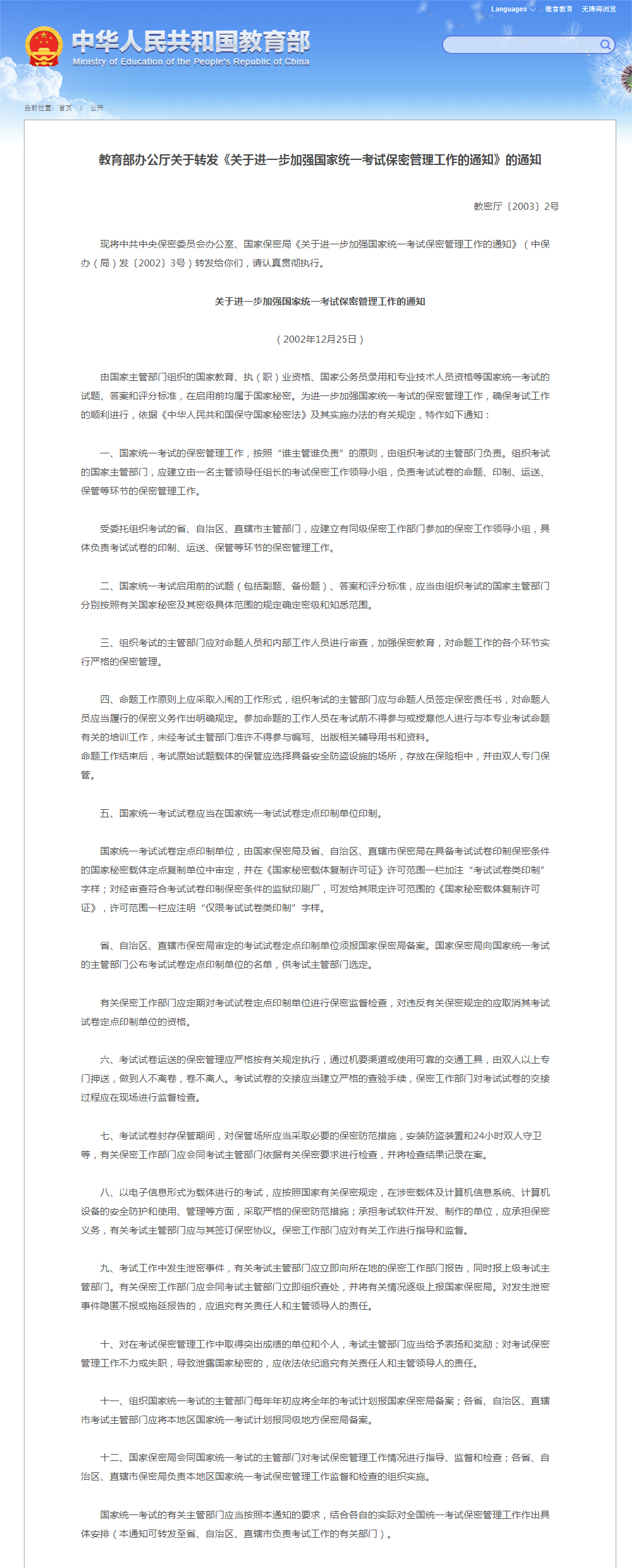 《关于进一步加强国家统一考试保密管理工作的通知》