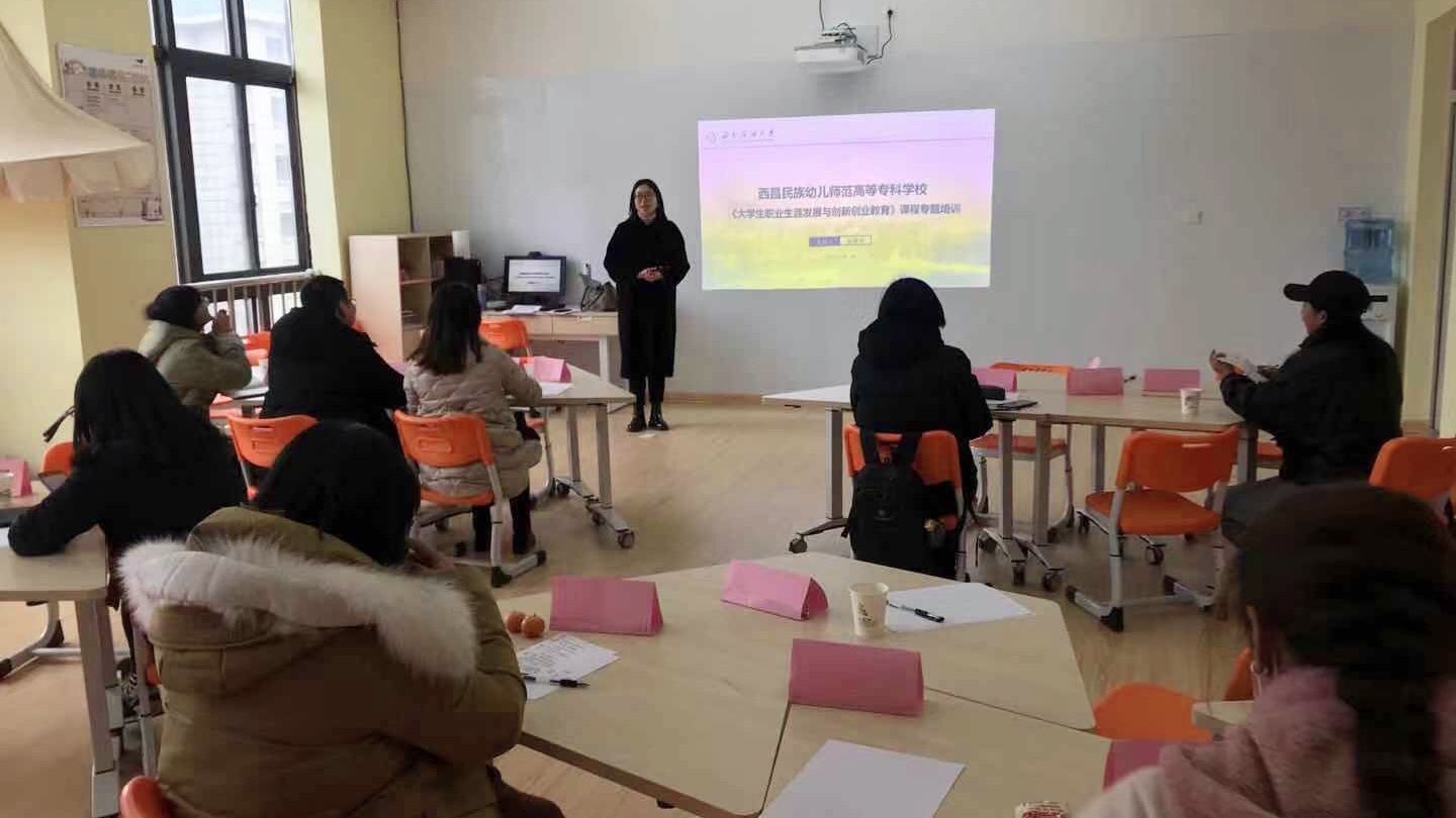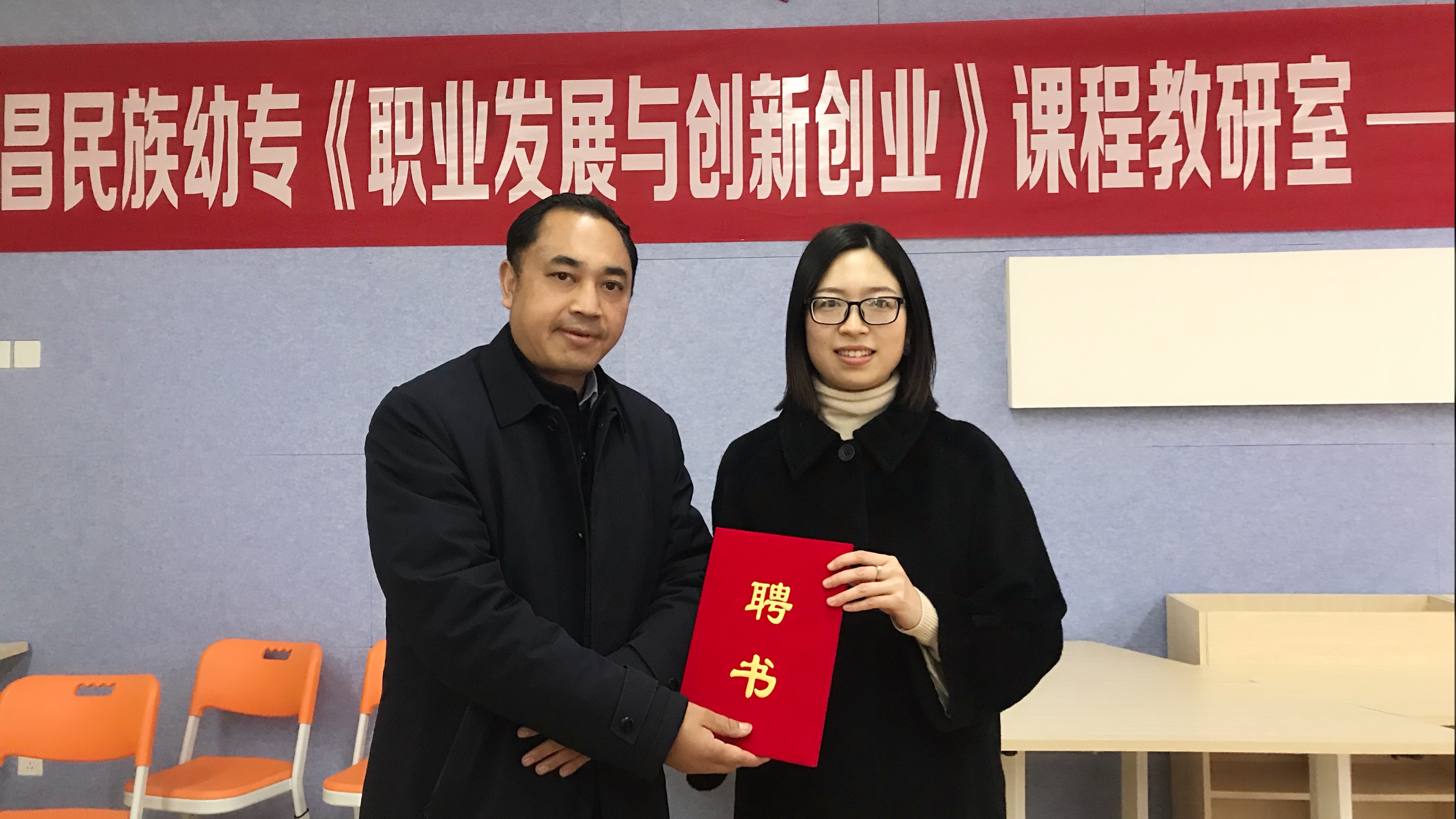 在欢快热烈的气氛中,马辉宣布“大学生职业发展与创新创业教育教研室”成立,同时为袁唯人、曾雅清颁发“西昌民族幼儿师范高等专科学校特聘培训讲师”证书。
