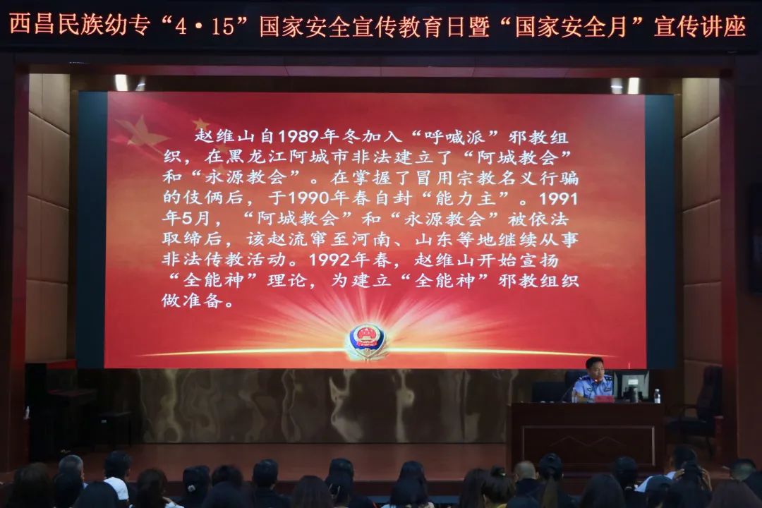 本次宣传讲座围绕国家安全的重要性展开,由西昌市公安局张军警官对邪教组织危害进行了详细的讲解。通过多种方式向在场师生普及反邪教意识和策略,张军还详细介绍了西昌市一些邪教组织以及被卷入其中的案例,提醒大家时刻保持警觉。张军指出,在校学生容易受到“三不原则”——不找政府、不找上级、不找法律来解决问题的影响,因此要想保证学生们不受煽动的影响并加强他们的安全意识,需要从学校本身入手,构建多元化、科学化的反邪教工作体系,不断提升师生的反邪教安全知识、能力和素养,从而实现全方位、立体化的“反邪教进校园”。