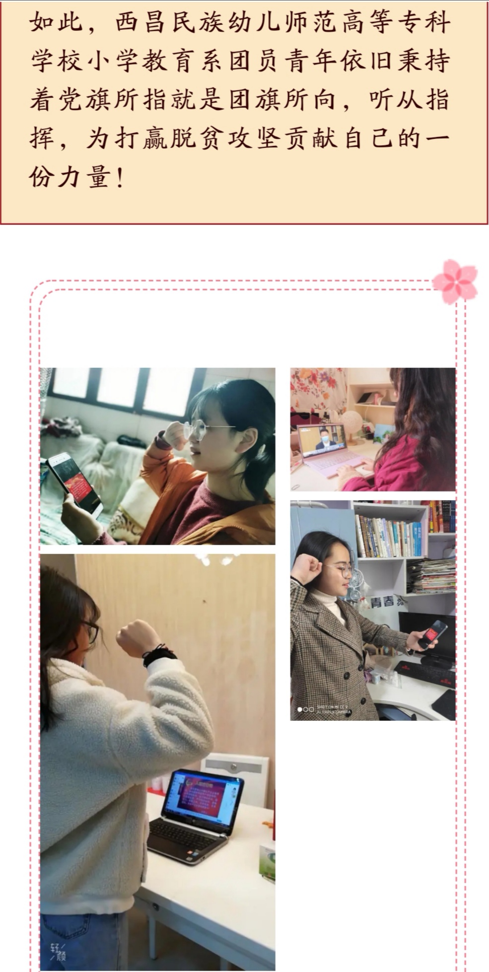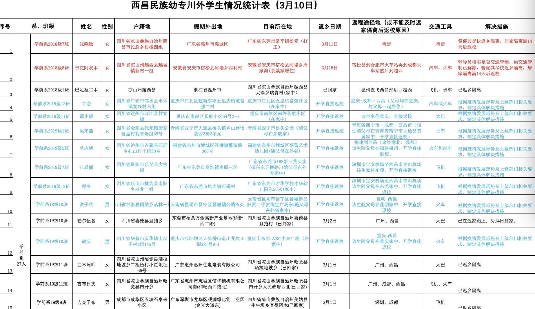 针对假期外出务工的学生,各班辅导员建立学生外地打工群,打电话给每个人询问情况,统计学生在外和返程等信息,告知他们尽快返家隔离,做好开学准备,每天上报健康情况,关心在外学子的一点一滴,确保每个同学的安全。大疫无情,人间有爱,在抗击疫情的关键时期,西幼学工队伍用坚守,用呵护,为学生撑起了一片蓝天