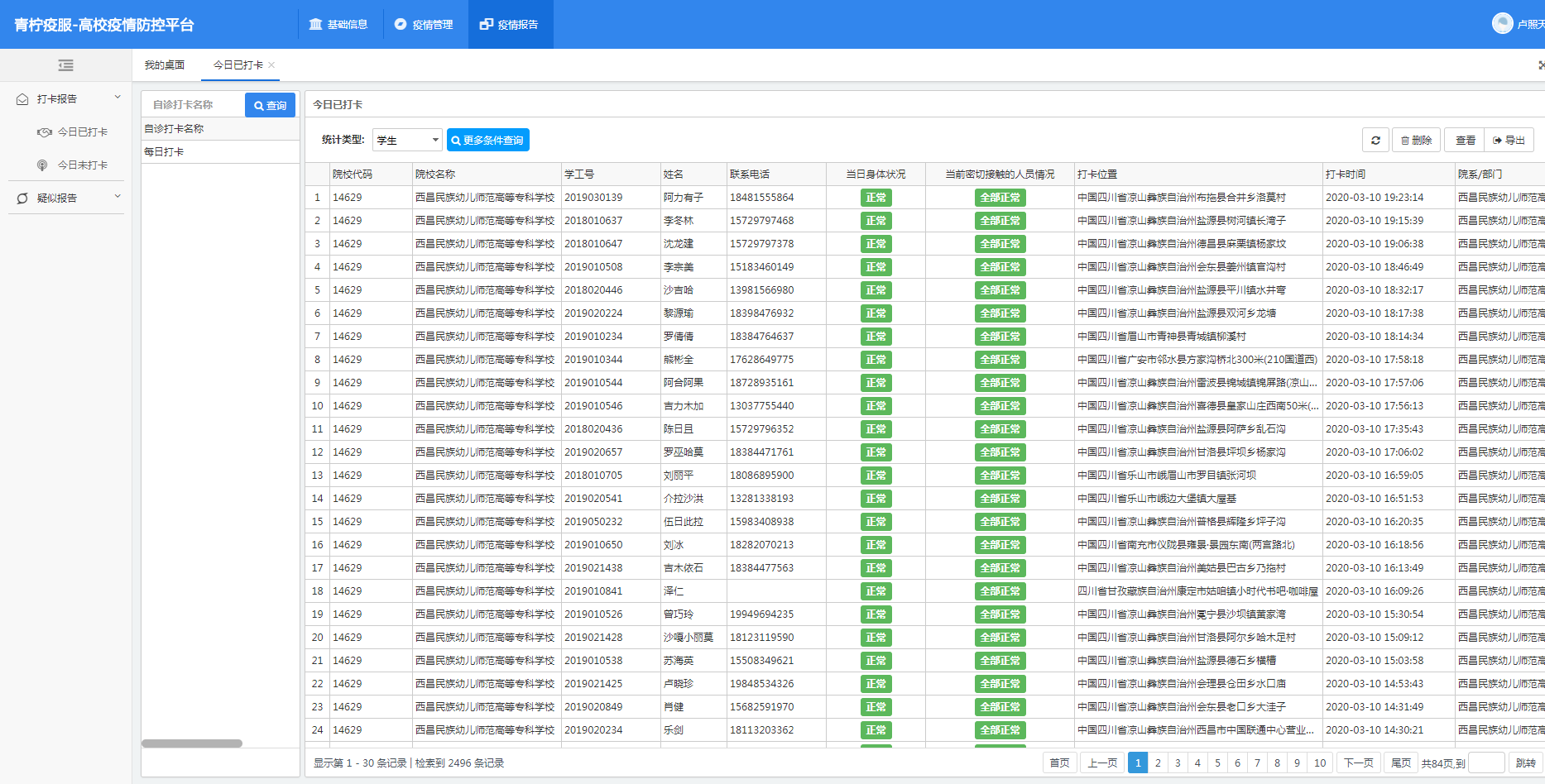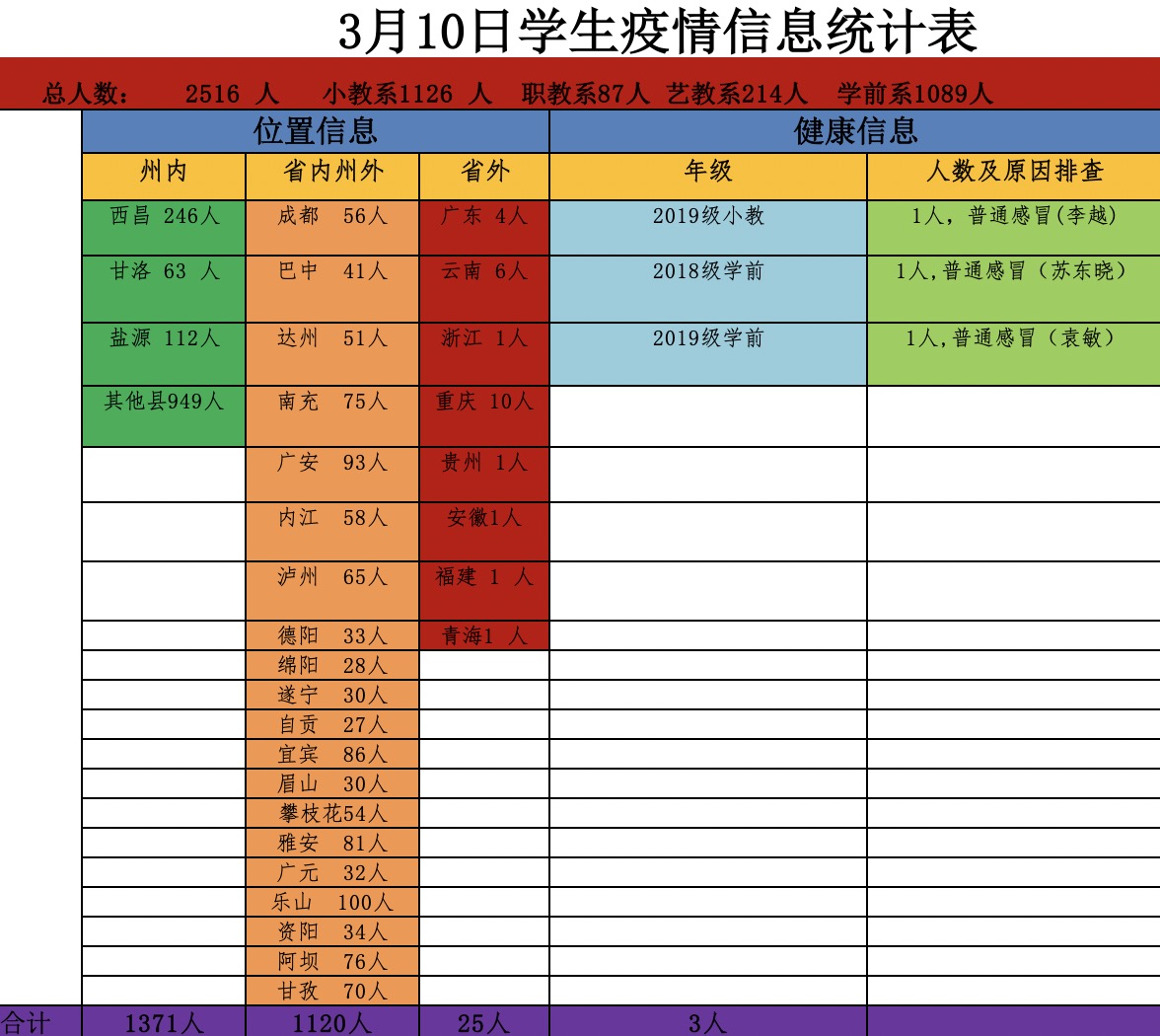 网格管理,防护网络密起来。建立学生工作处+系部+年级长+辅导员联防体系,辅导员对所负责年级的摸排工作进行了严密部署,直接指挥到班级,采集信息一个都不能少,保证每一个学生上报数据信息的实效性、准确性,严格汇总,认真落实日报告”“零报告制度。制作疫情健康信息填报系统,确保每一个学生信息准确无误,对信息不准确的学生电话联系,完善信息。目前学校在校生2516人,截止38日晚,在州内学生1369人,省内州外1122人,省外25人。