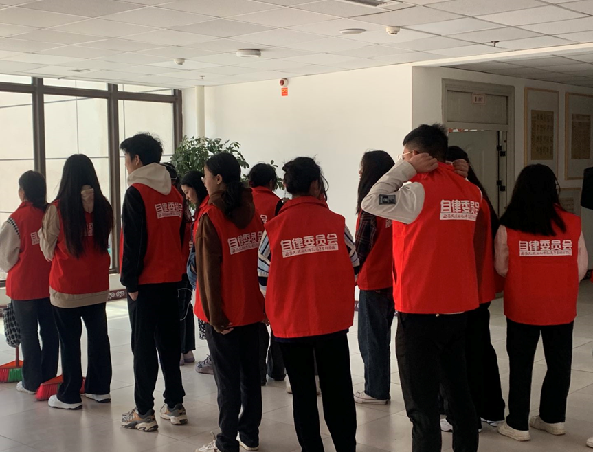 3月30日,30名自律委员会同学分为5组,对学校操场、教室走廊、办公室等进行打扫,“红马甲”成为了一道靓丽的风景线。