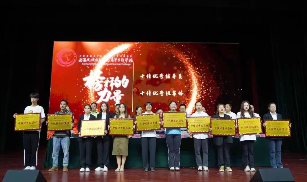 此外,典礼表彰了“十佳优秀辅导员”“十佳优秀班集体”,宣读了《关于表彰学生先进集体和优秀个人的决定》。优秀辅导员代表马小祥在发言中表示:“辅导员工作是一门值得毕生研究和探索的课题,是一项关系学生健康发展的艰巨事业。在接下来的工作中,我将与所有辅导员同仁一道,牢记校训,发扬学校‘艰苦奋斗 感恩奋进’的精神,充满激情、满怀动力,继续做好学生管理服务工作。”优秀学生代表小学教育系2020级11班周润涵以“沉甸甸的成绩单”阐述了三年来的大学时光,“现在我以五学期专业成绩第一,综测第一的成绩推免至四川师范大学继续学习。无数个失眠的夜晚、浸湿的枕头最终换来了沉甸甸的收获,我倍感幸福。天行健,君子以自强不息。拥抱收获的同时我也看到自身在存在的不足,在今后的学习中,我将更加努力,成为更好的自己。”