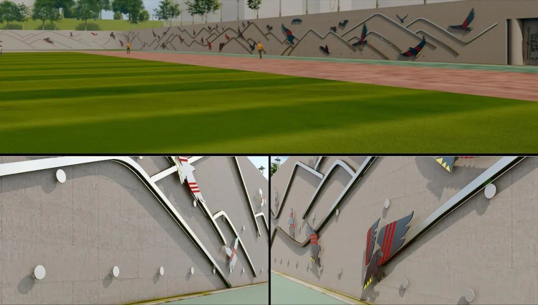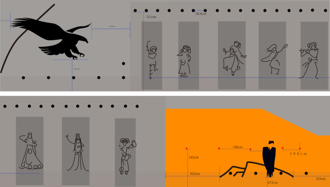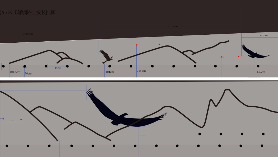 墙绘采用镜面不锈钢材料制作,长约460米,用极简单而精湛的表现手法呈现在我们面前,栩栩如生,“仿佛让师生置身于大自然中”。伴随着人文象征的雄鹰,穿越盘旋于古法象形单线手法勾勒出来的凉山地理万状雄貌之中,代表地球纪元的亿万年海平变化线,以及上古北斗绕极的天道时空,构成了一幅“天-地-人与万物协同演进”的波澜壮阔史诗,在重峦叠嶂中营造出新时代极具民族同源特色的“整体美育”宏大创新篇章。“伸手触摸,冰凉的墙面仿佛能将人们轻轻吸进古代图绘里。再看向那灵动展翅高飞的雄鹰,仿佛预示着凉山古老而悠久的文化正呼唤着传承与创新的未来。”值得一提的是,雄鹰贯越的众多匹配北斗天文的28星宿点缀,糅合着中华传统仰观元宇的精髓,尤其是中华上古先圣采用一种奇特的数理模型,拟象宇宙法则创作出的河图历法(古彝称“五生十成图”),又增加了一份民族同源文化的独特深邃气息。