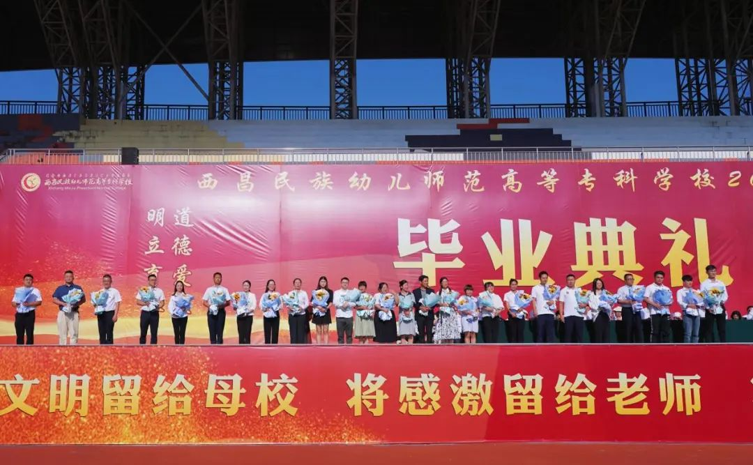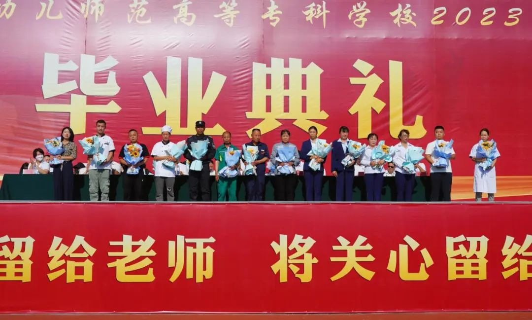 ▲毕业生向教师代表、学生管理人员代表献花▲