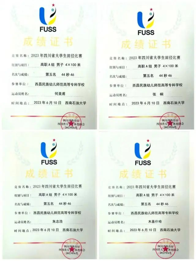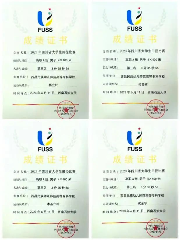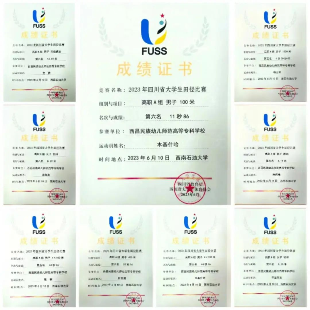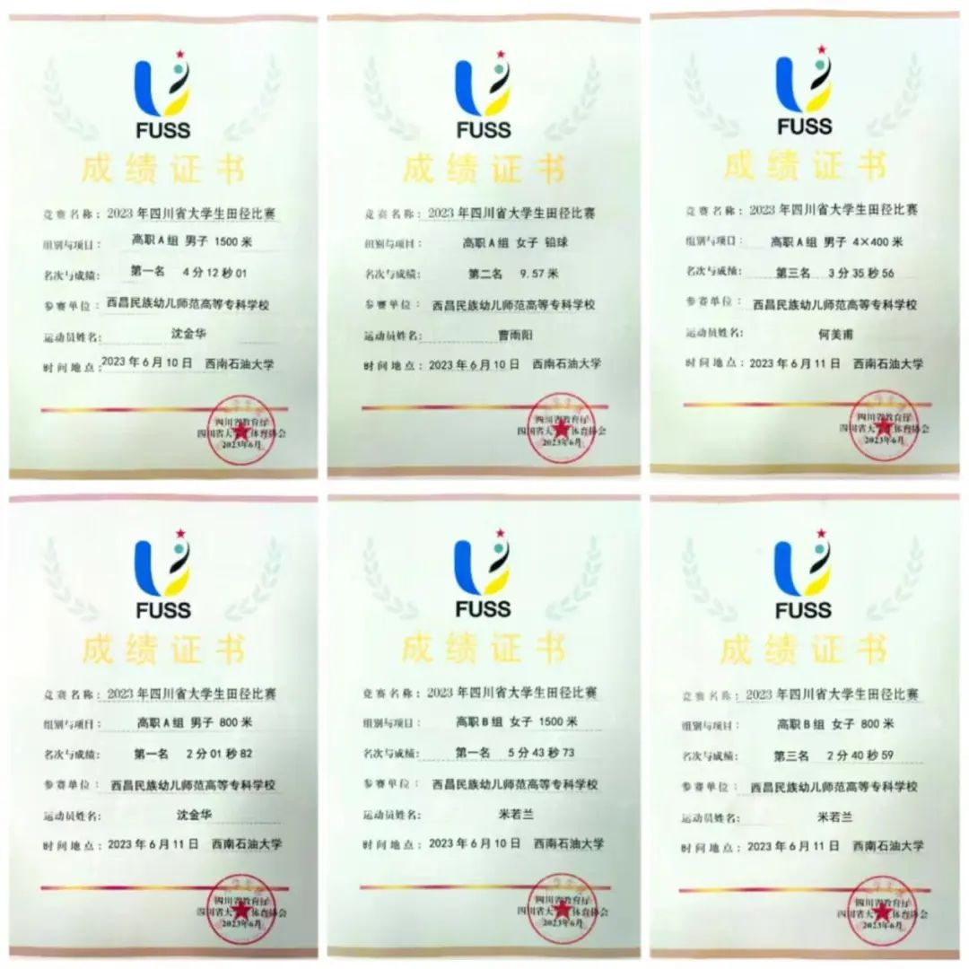 个人奖项:1、沈金华同学获得高职高专男子 A 组1500米第一名;2、米若兰同学获得高职高专女子 B 组1500米第一名;3、曹雨阳同学获得高职高专女子 A 组铅球第二名;4、沈金华同学获得高职高专男子 A 组800米第一名;5、米若兰同学获得高职高专女子 B 组800米第三名;6、杨立针同学获得高职高专男子A组1500米第五名;7、木基什哈同学获得高职高专A组男子100米第六名;8、何美甫同学获得高职高专A组男子400米第六名;9、唐韵曦同学获得高职高专A组男子跳远第七名;10、文震同学获得高职高专A组男子三级跳远第八名;11、甲查阿衣同学获得高职高专A组女子铅球第八名;12、泽郎准同学获得高职高专B组女子铅球第八名;