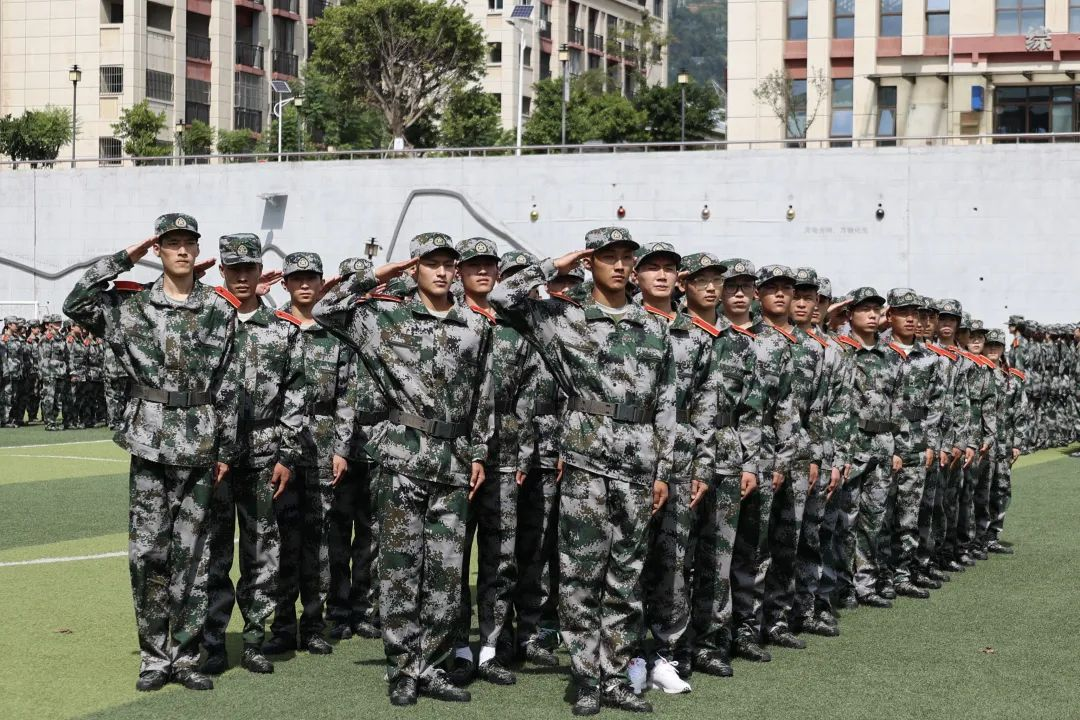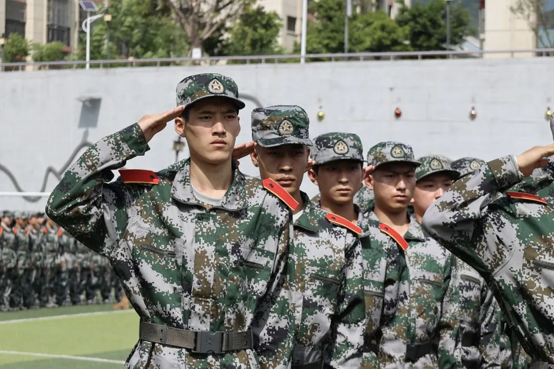 敬礼时,右手迅速取捷径从胸前抬起,右臂与肩同高,前臂、手掌呈一条直线,五指并拢,掌心稍向外翻,约三十度。戴帽时,右手中指贴于帽檐外2公分处。