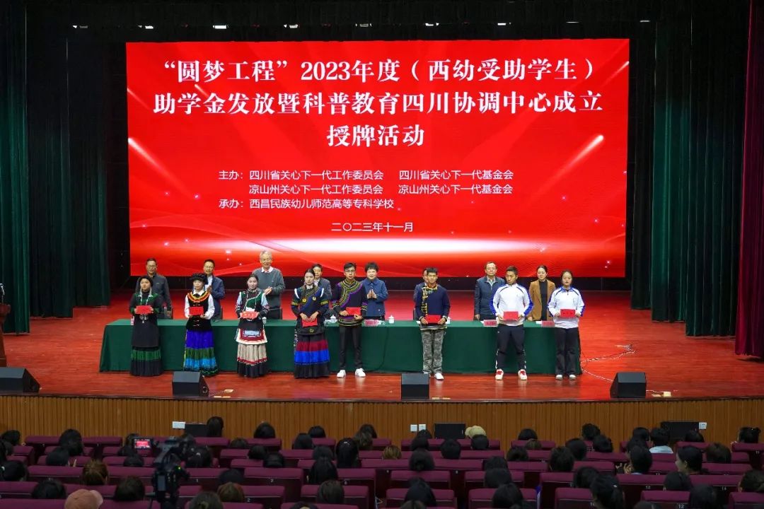 11月10日,“圆梦工程”2023年度(西昌民族幼专受助学生)助学金发放暨科普教育四川协调中心成立授牌活动在我校举行。