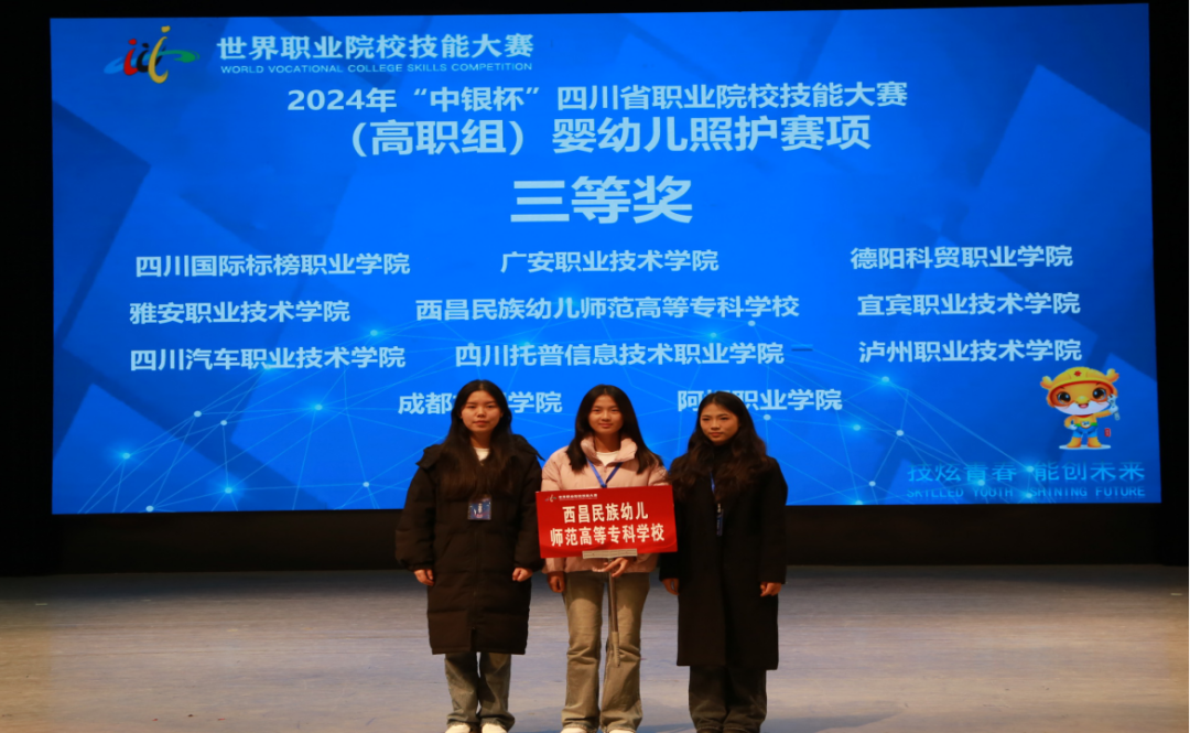 近日,2024年“中银杯”四川省职业院校技能大赛(高职组)婴幼儿照护赛项在川北幼儿师范高等专科学校成功举办。我校学前教育系早期教育专业学生朱举梦、王艳、刘书兰代表学校参赛,荣获团体三等奖。