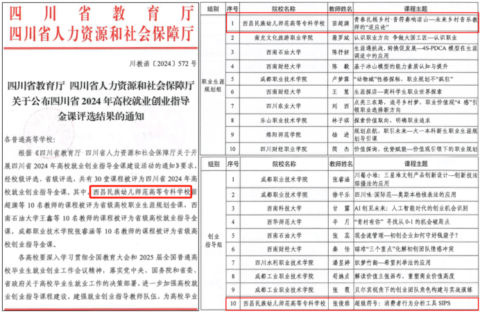 近日,四川省教育厅、四川省人力资源和社会保障厅公布了2024年高校就业创业指导金课评选结果(川教函[2024]572号)。我校苗超渊主讲的《青春扎根乡村·音符奏响凉山—未来乡村教师的“适应论”》以评分第一名入选职业生涯规划组省级金课。张俊雅主讲的《超级符号:消费者行为分析工具SIPS》入选创业指导组省级金课。