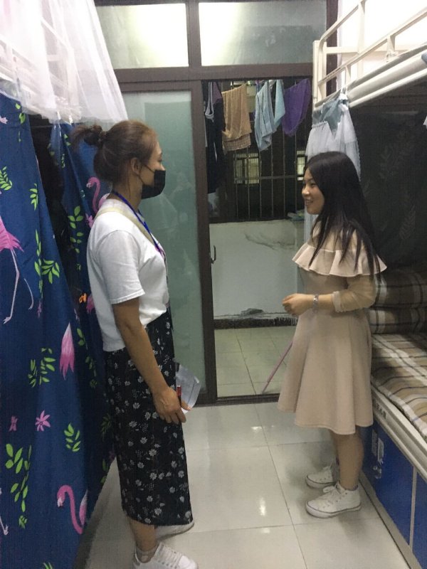 自律会同学们在检查卫生的同时,关心留寝同学的健康问题,询问和观察他们的身体是否异常。并告知端午期间同学们不去疫情中高危地区。自律会检查人员对同学进行关心,提醒同学们雨季来临外出关好门窗,断电源,不去危险水域玩耍、游泳等避免意外事故的发生。