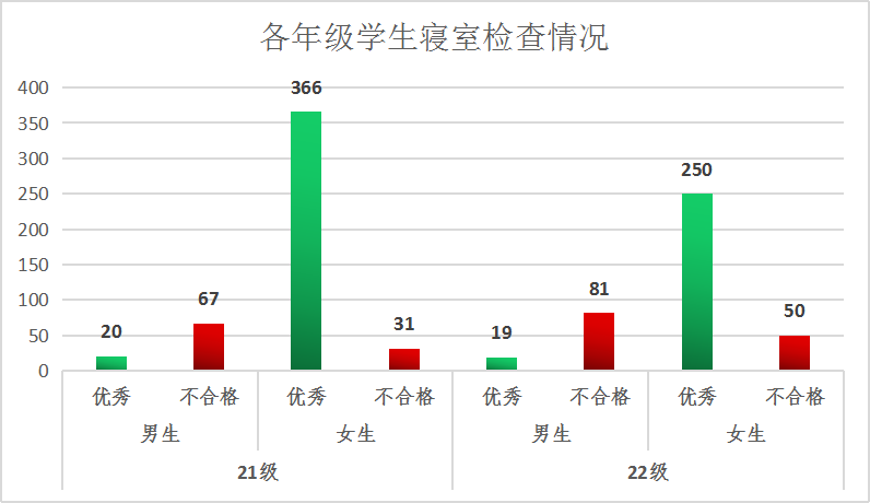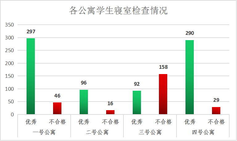 通过检查数据可见,四号公寓的学生内务卫生整理意识明显要领先其他公寓;三号公寓的学生内务卫生整理意识薄弱,检查为不合格的寝室的数据高于其他公寓;二号公寓主要入住20级学生(除小教系