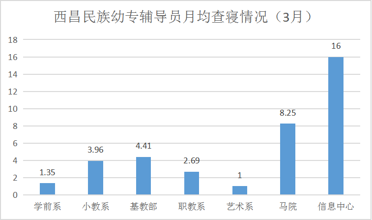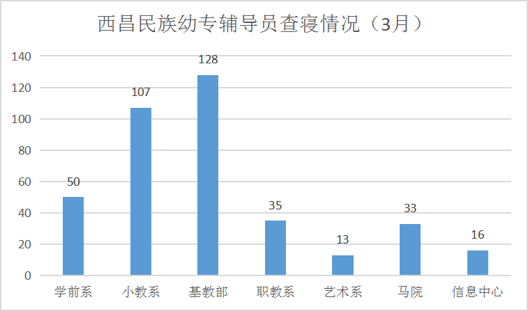 从单个数据来看,基础教学部虽然各班辅导员深入学生寝室的频率相比其他教学单位较高,但是对照该部其他检查数据来看,效率并不明显;艺术教育系各班辅导员在3月份查寝工作中,只有吉各阿俄(12次)和罗乐(1次)两位老师深入学生寝室。
