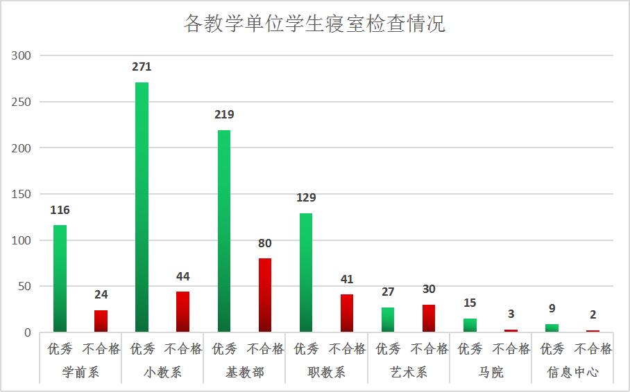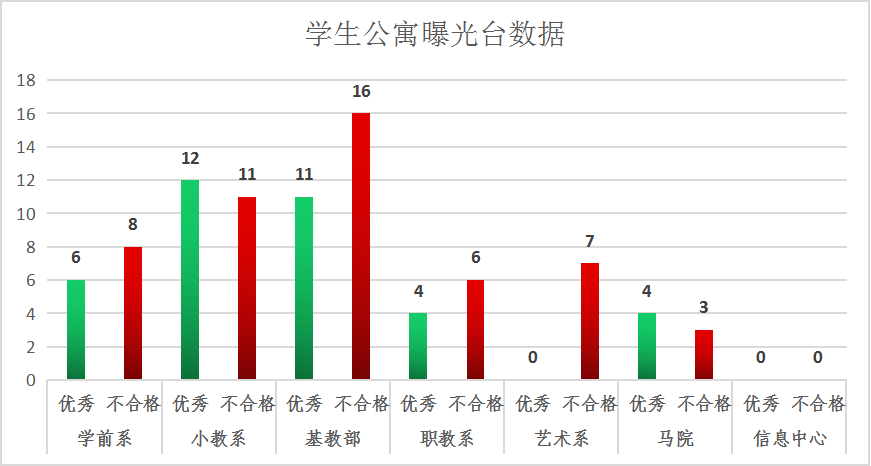 就目前而言,学前系、小教系、基教部的学生比重较大,分配的房间较多,因此数据较为突显。但是通过数据可见,基础教学部的内务卫生整理水平明显要落后于学前系、小教系,主要原因还是两极分化较为明显。