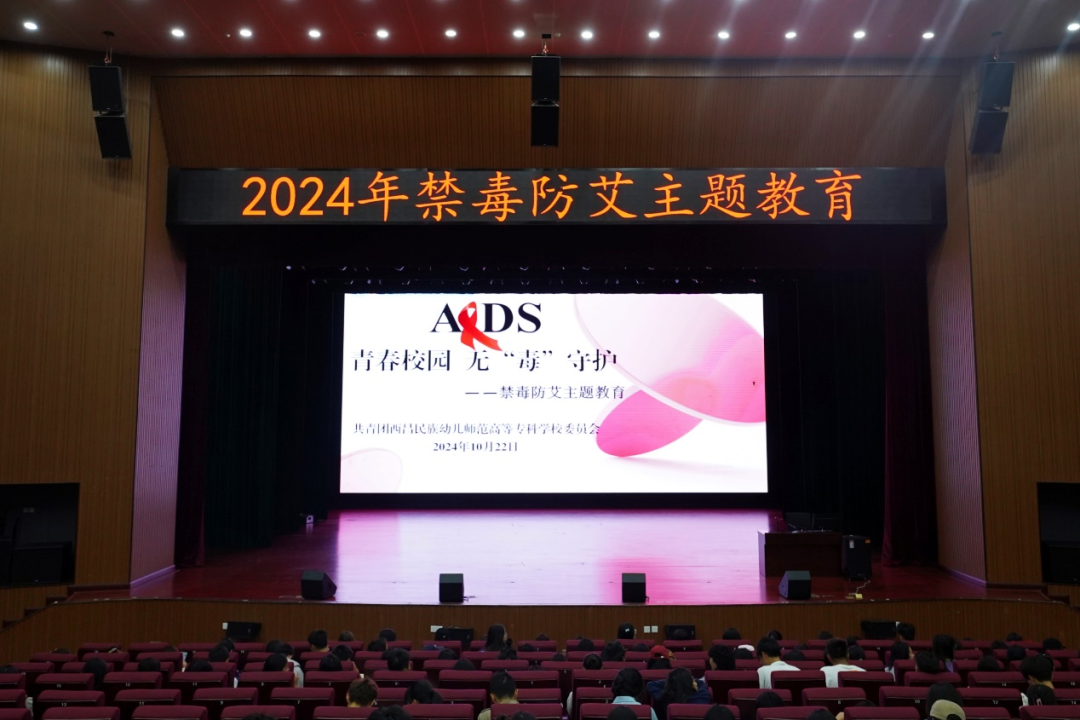 10月22日,共青团西昌民族幼儿师范高等专科学校委员会在雏鹰剧院成功举办了“青春校园 无‘毒’守护”禁毒防艾主题教育。学校各系部团总支书记、副书记及各班班长、团支书、组织委员、宣传委员和校团委部分学生干部参加活动。