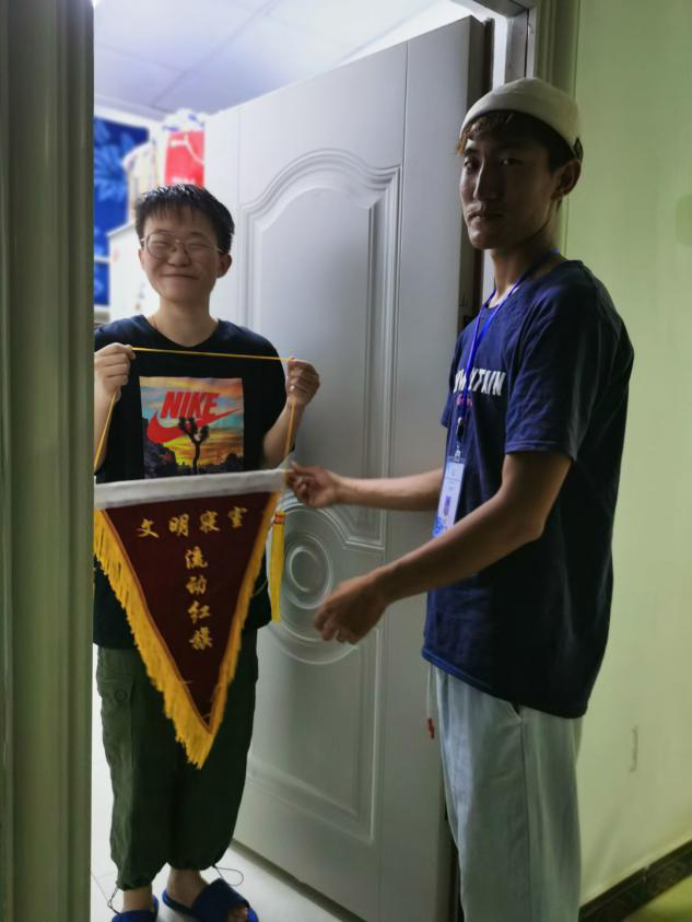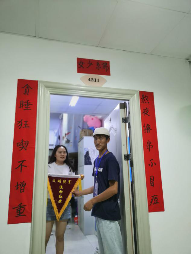 为进一步优化我校育人环境,加快学校文明建设,培养学生良好的生活习惯,激励学生遵纪守法,推动校纪学风建设,7月7日,学生处对我校寝室纪律、卫生、寝室文化等情况进行了文明寝室的评比,评选出了6个文明寝室。学生处处长邹华率领自律委员会成员为“文明寝室”颁发流动红旗。并叮嘱此次获奖的同学,一定不要骄傲,要守住红旗,为班级争荣誉。