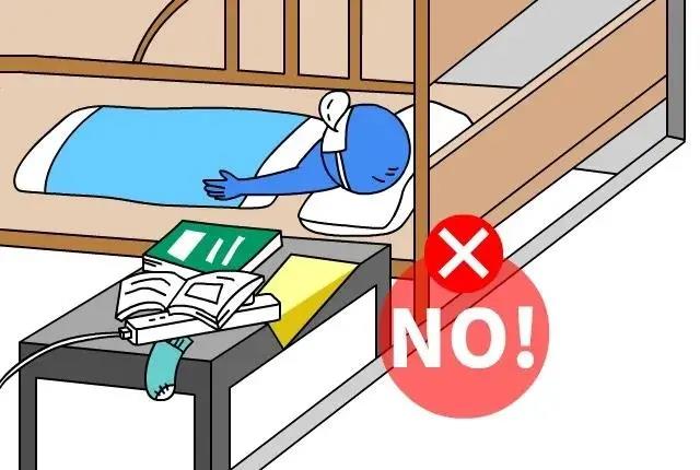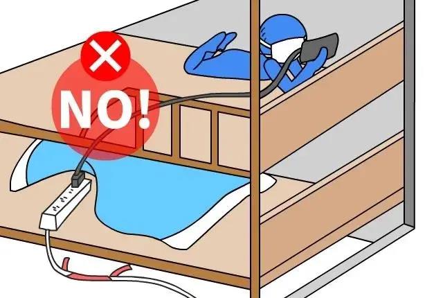 为了方便,一些同学私拉电线到床上使用,这种行为非常危险,床上可燃物品多,有可能被发热的电线引燃。