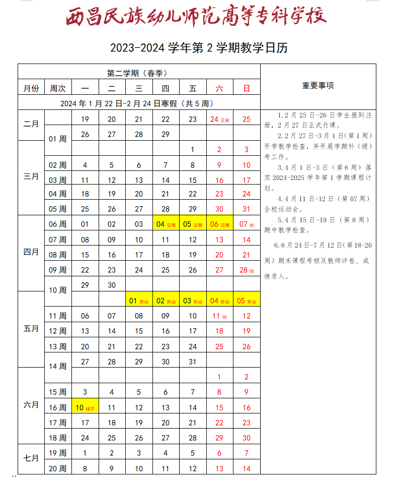 西昌民族幼儿师范高等专科学校2023-2024学年第2学期教学日历