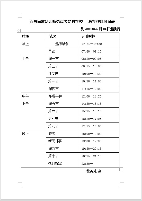 西昌民族幼儿师范高等专科学校 教学作息时间表