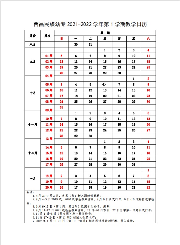 西昌民族幼专 2021-2022 学年第 1 学期教学日历